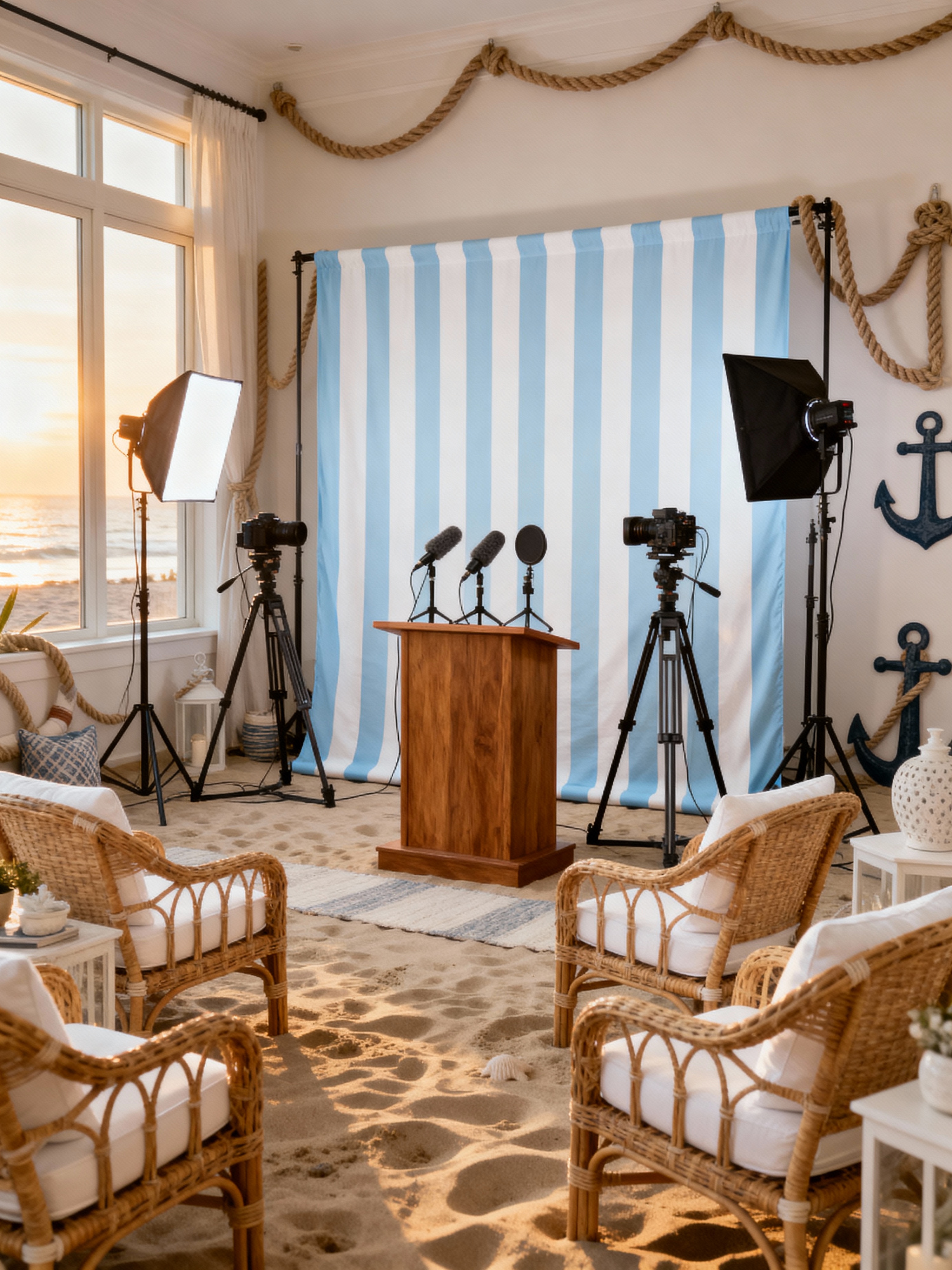 press room with coastal style with backdrop and recording equipment and lighting equipment and microphones and podium and tripods and chairs and cameras. . with beach vibes and relaxed style and natural materials and wicker furniture and nautical decor and white decor and seaside colors and sand tones