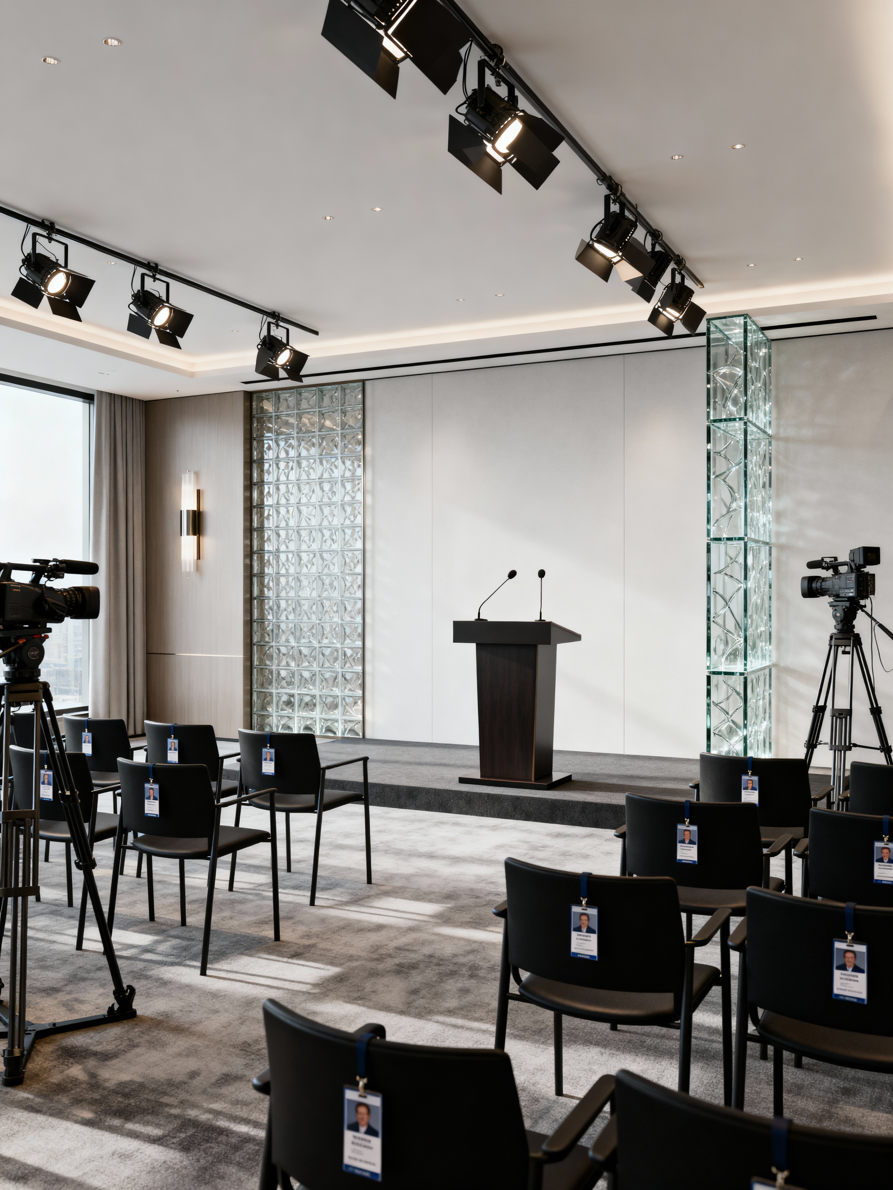 press room with contemporary style with lighting equipment and chairs and podium and cameras and recording equipment and tripods and press badges and microphones. . with elegant simplicity and clean look and metal accents and glass decor and minimalist and sleek lines and neutral palette and high contrast