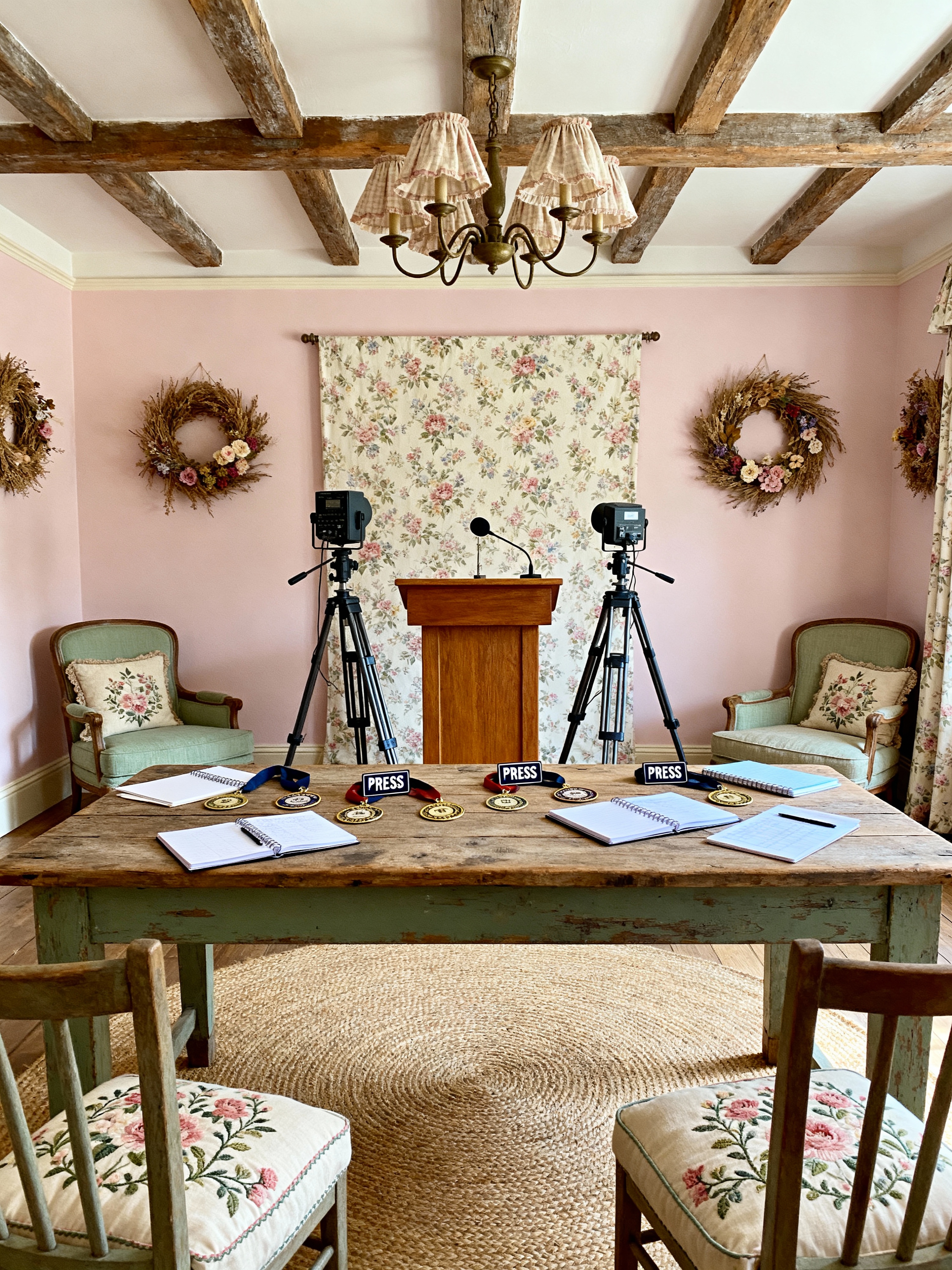 press room with cottagecore style with tripods and press badges and notebooks and backdrop and podium and chairs and recording equipment and microphones. . with natural and floral patterns and muted colors and rustic and traditional and cottage style and country style and organic