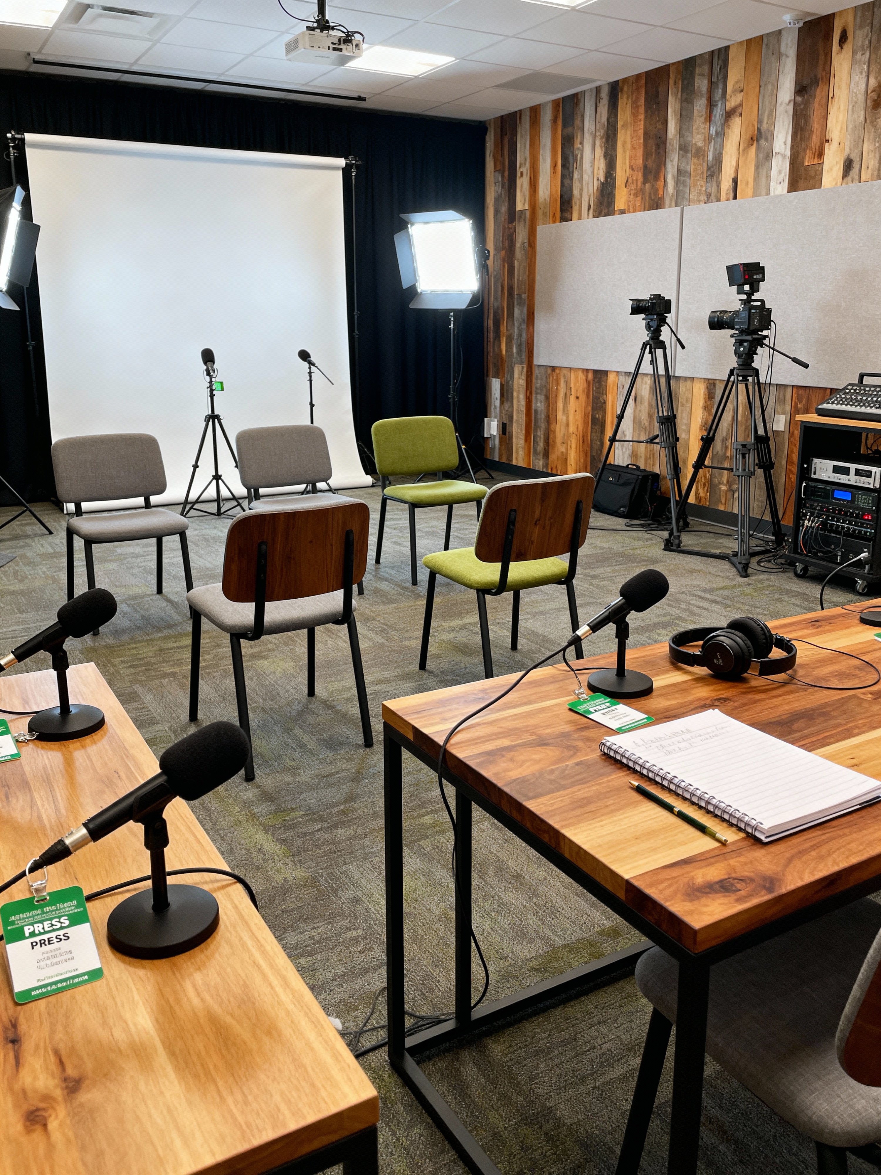 press room with eco-friendly style with chairs and microphones and press badges and lighting equipment and backdrop and tripods and notebooks and recording equipment. . with non-toxic finishes and reclaimed wood and recycled elements and energy efficient and renewable resources and organic textiles and sustainable materials and environmentally conscious