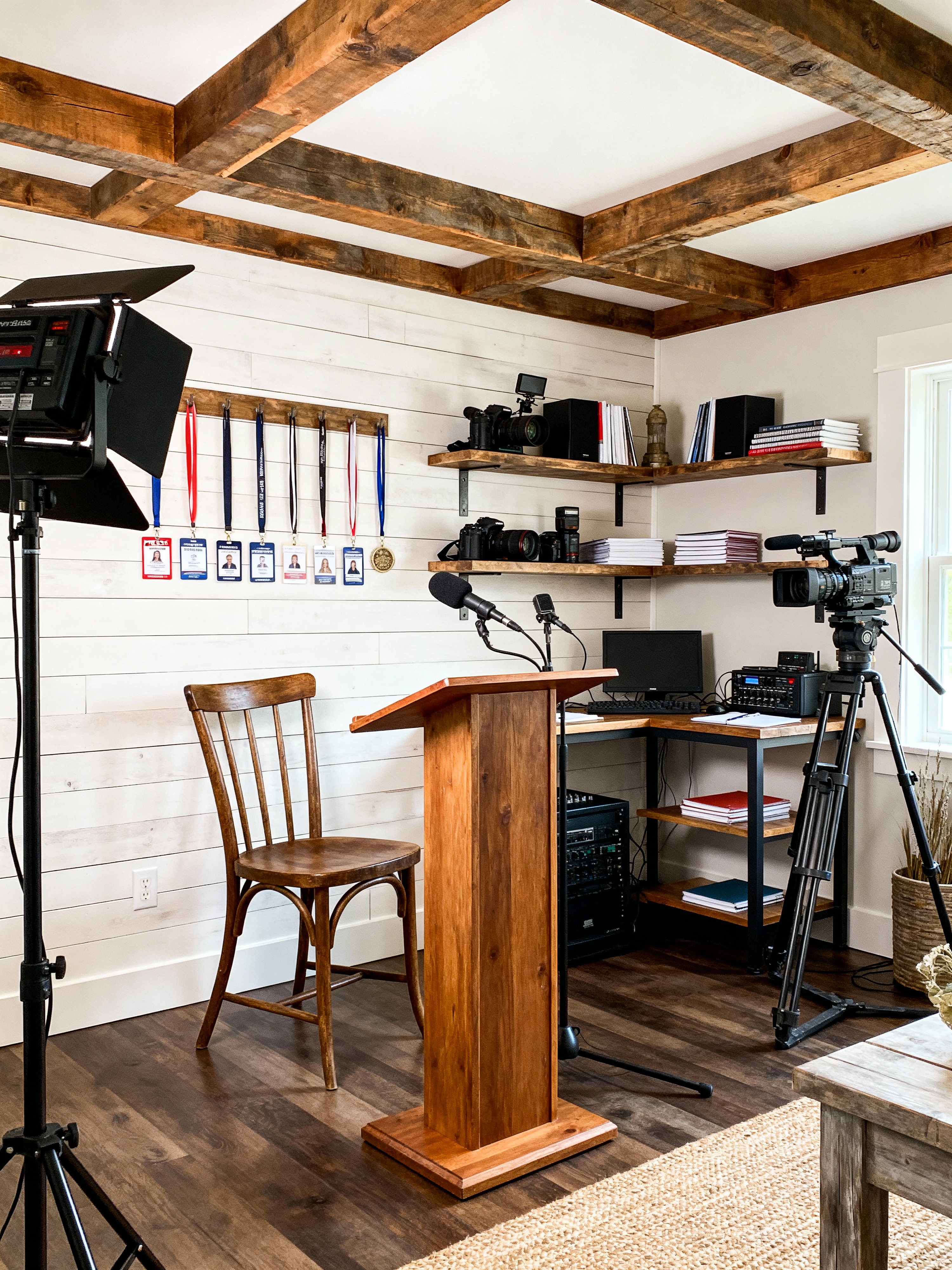 press room with farmhouse style with cameras and chairs and press badges and recording equipment and tripods and podium and lighting equipment and notebooks. . with open shelving and country style and natural textures and rustic charm and cozy feel and shiplap walls and industrial accents and exposed wood