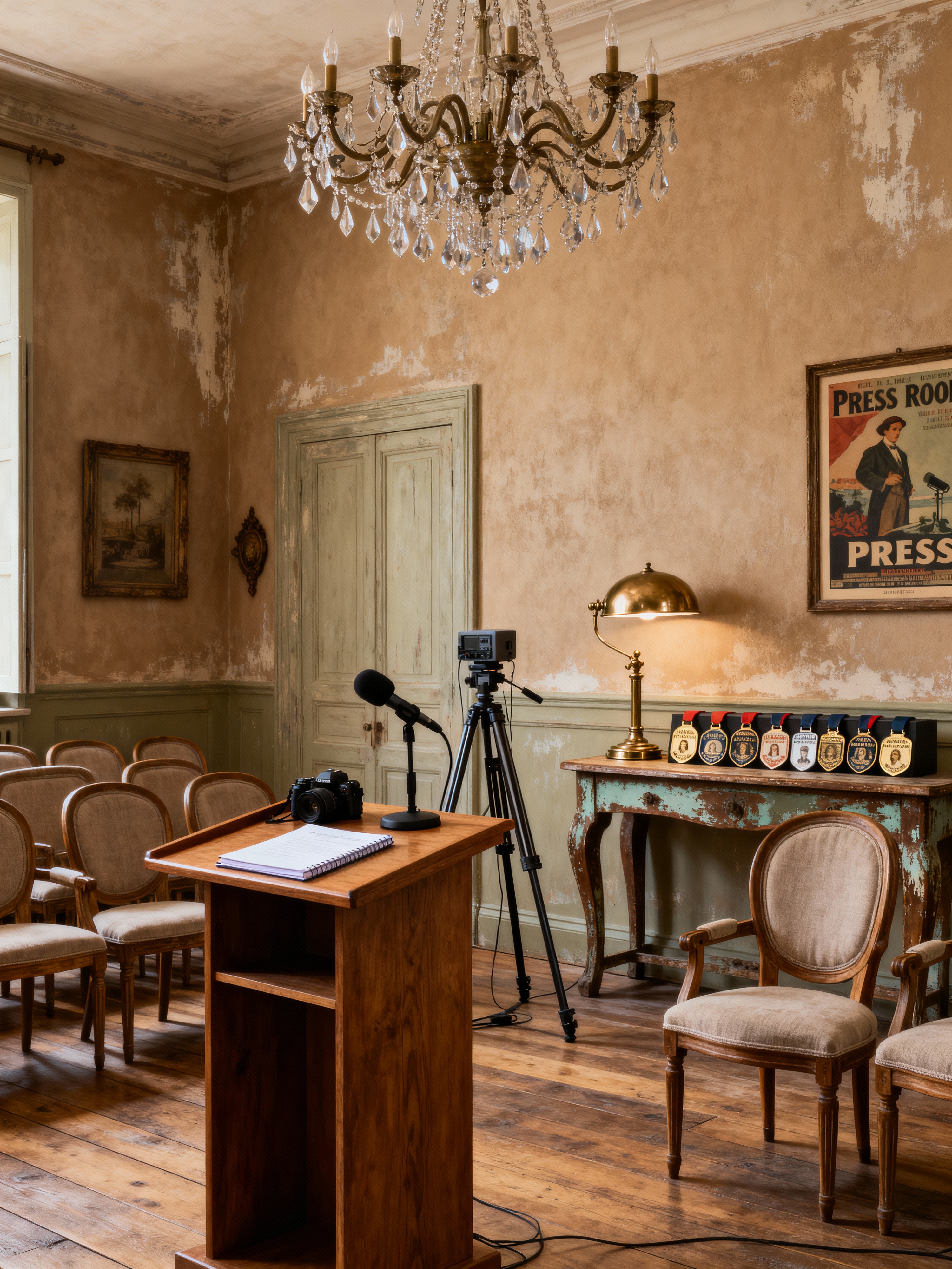 press room with french country style with microphones and podium and notebooks and cameras and tripods and recording equipment and press badges and chairs. . with country elegance and textured walls and elegant rustic and chandeliers and soft fabrics and distressed wood and vintage furniture and antique decor