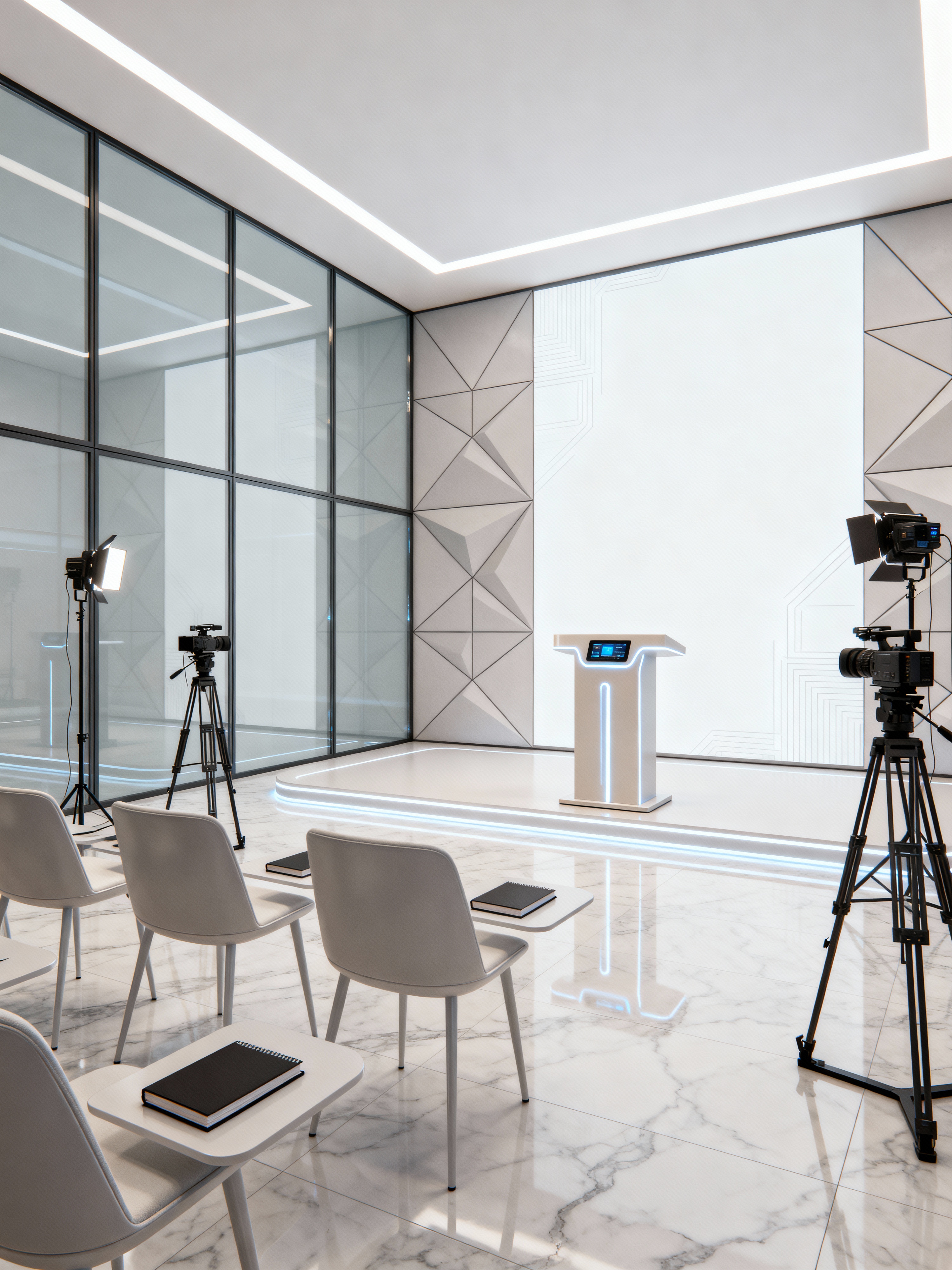 press room with futuristic style with chairs and tripods and recording equipment and cameras and lighting equipment and notebooks and podium and backdrop. . with minimalist clean lines and futurism and glass panes and futurism minimalist interior and neutral background and bright accents and strong geometric walls and light colors and smooth marble