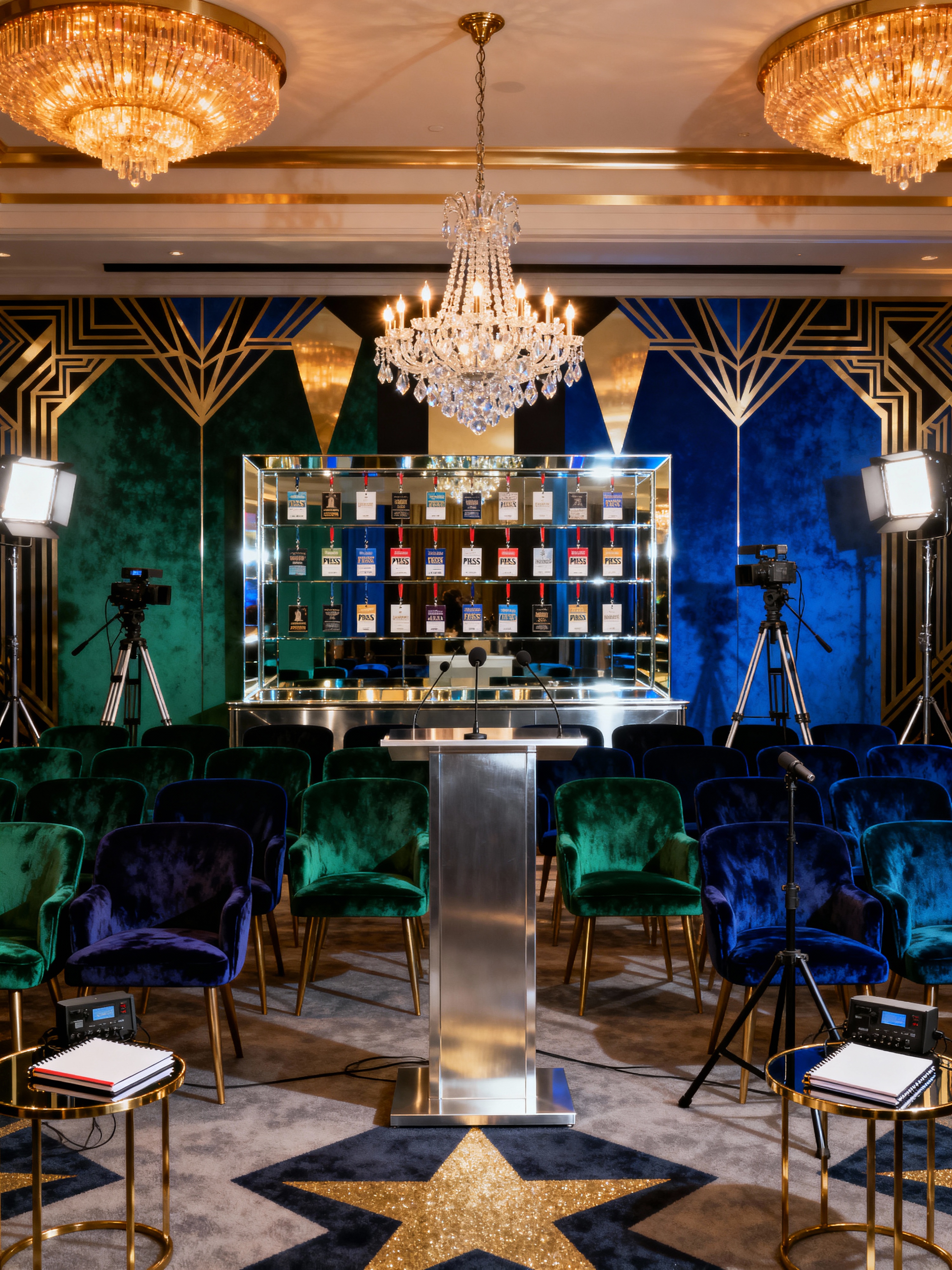 press room with hollywood glam style with press badges and backdrop and chairs and podium and lighting equipment and tripods and recording equipment and notebooks. . with velvet upholstery and crystal chandeliers and metallic accents and bold colors and mirrored surfaces and art deco influence and glamorous style and star quality