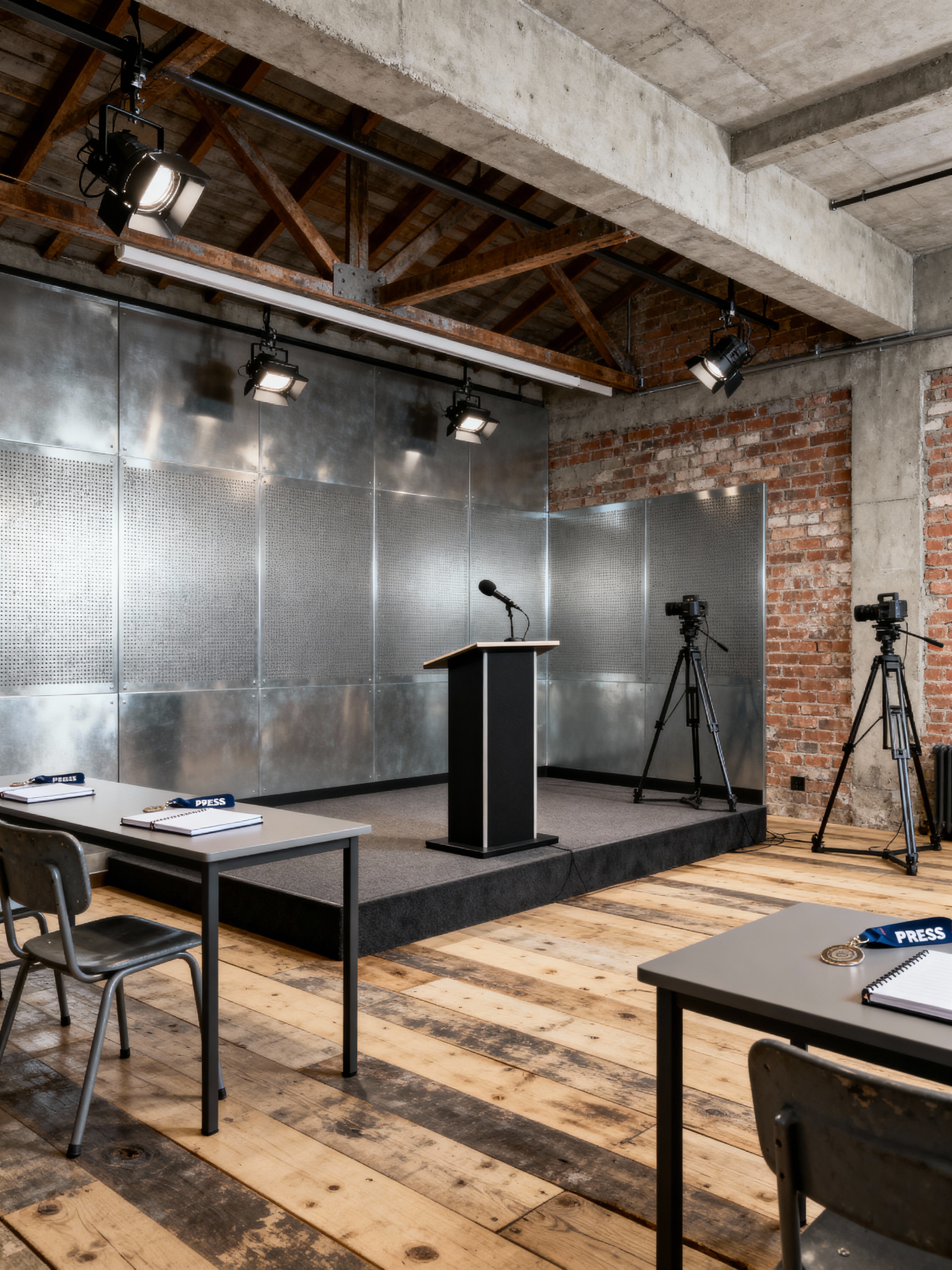 press room with industrial style with notebooks and podium and tripods and chairs and microphones and press badges and recording equipment and lighting equipment. . with utilitarian objects and reclaimed wood and exposed brick and exposed concrete and neutral tones and metal panels and raw aesthetic and exposed rafters