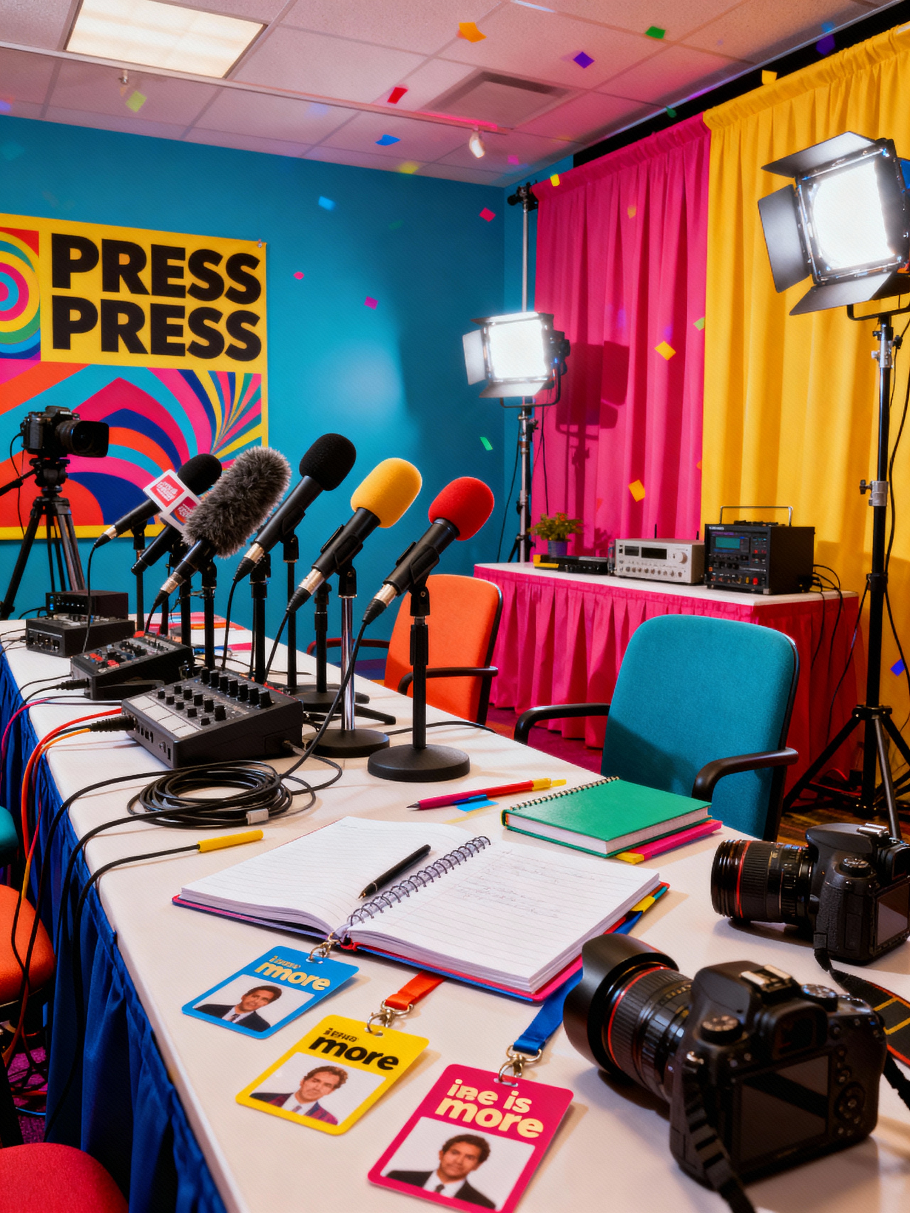 press room with maximalist style with microphones and recording equipment and notebooks and cameras and backdrop and press badges and chairs and lighting equipment. . with bold design and eye-catching and bold colors and bold patterns and bold creativity and over-the-top aesthetic and more is more philosophy and vibrant