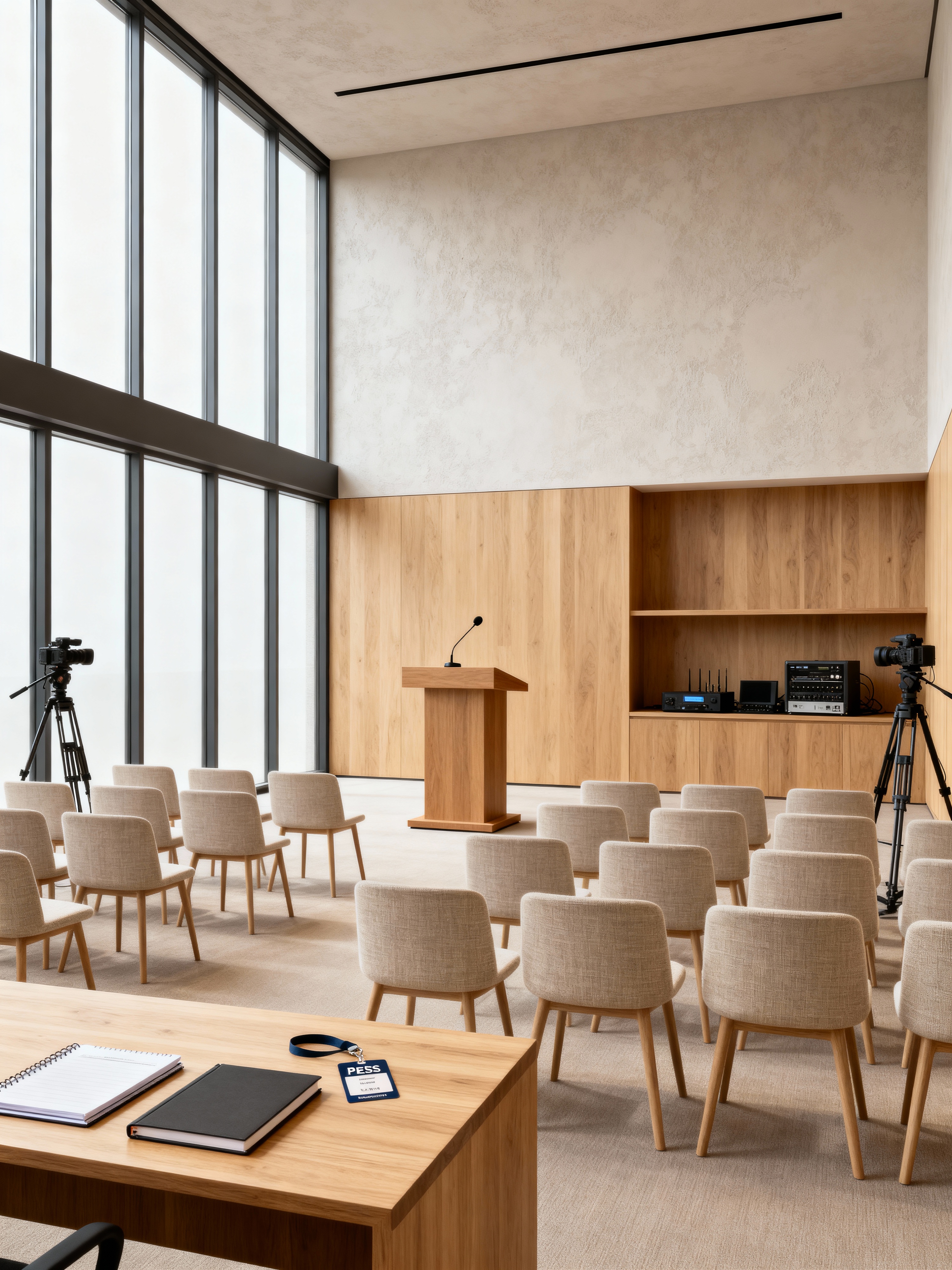 press room with modern style with cameras and chairs and notebooks and press badges and tripods and microphones and recording equipment and podium. . with open and natural lighting and natural materials and elements and practicality and functionality and neutral walls and textures and simple, clean lines and simplistic furniture and open and natural lighting