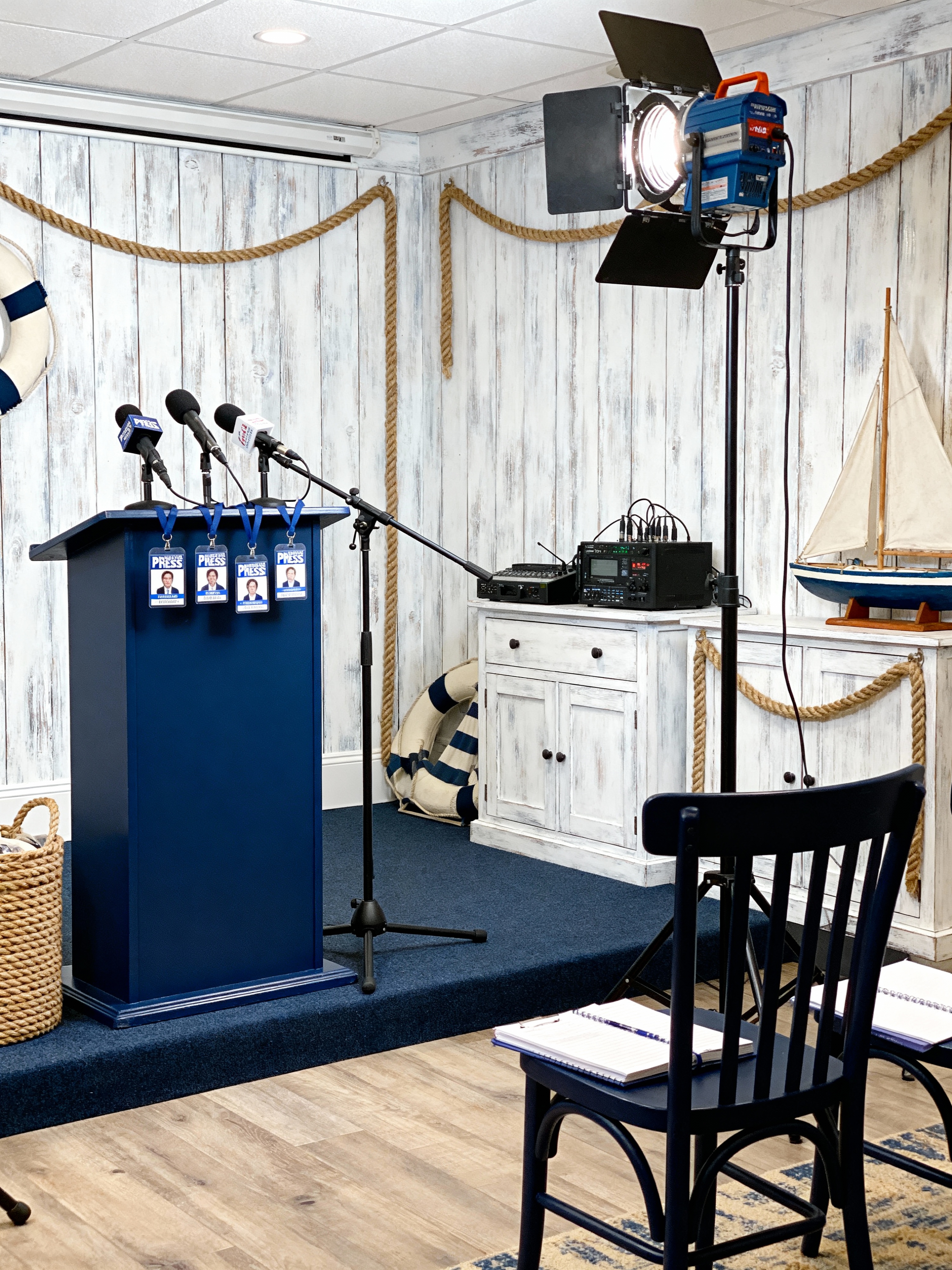 press room with nautical style with podium and microphones and tripods and press badges and recording equipment and notebooks and chairs and lighting equipment. . with coastal vibes and rope details and weathered wood and seaside charm and sailboat elements and crisp white and ocean inspiration and navy blue