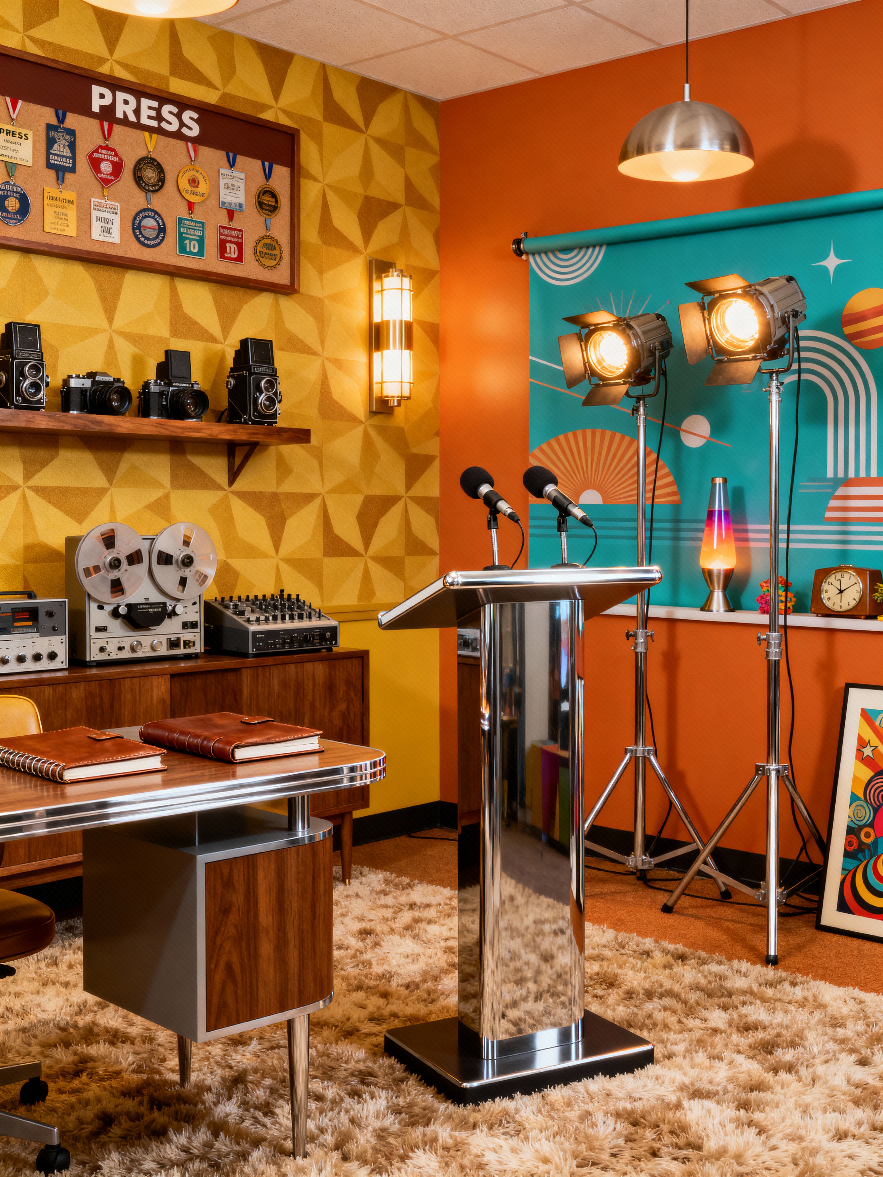 press room with retro style with press badges and cameras and backdrop and lighting equipment and notebooks and microphones and recording equipment and podium. . with bold patterns and chrome accents and vintage revival and space age and nostalgic pieces and bright colors and funky decor and groovy vibes