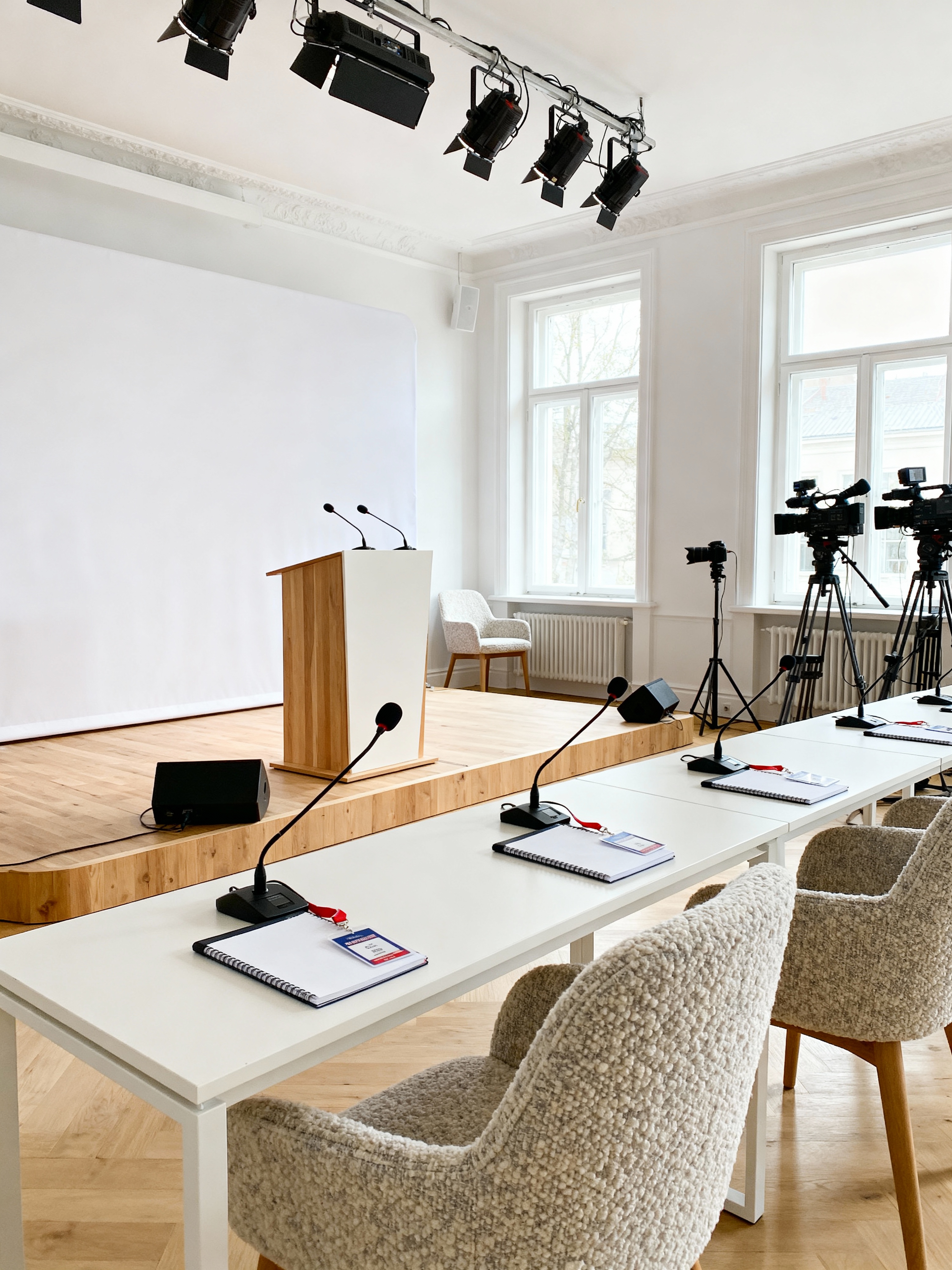 press room with scandinavian style with microphones and lighting equipment and backdrop and podium and cameras and press badges and notebooks and chairs. . with minimalist design and natural light and light wood and simple elegance and cozy atmosphere and textured fabrics and white decor and functional furniture