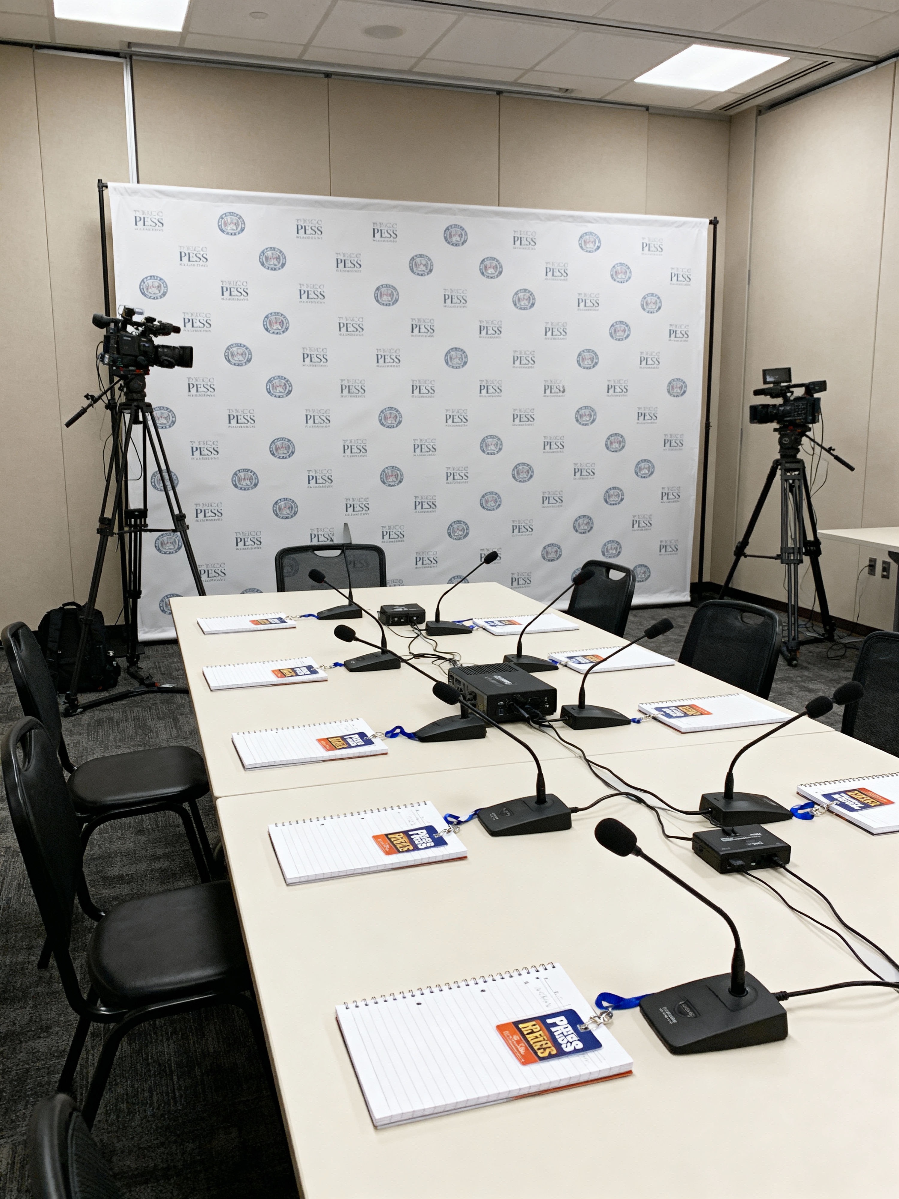 press room with simple style with backdrop and notebooks and press badges and recording equipment and microphones and chairs and tripods and cameras. . with understated style and essential pieces and basic elements and uncluttered space and pure simplicity and calm atmosphere and streamlined look and functional furniture
