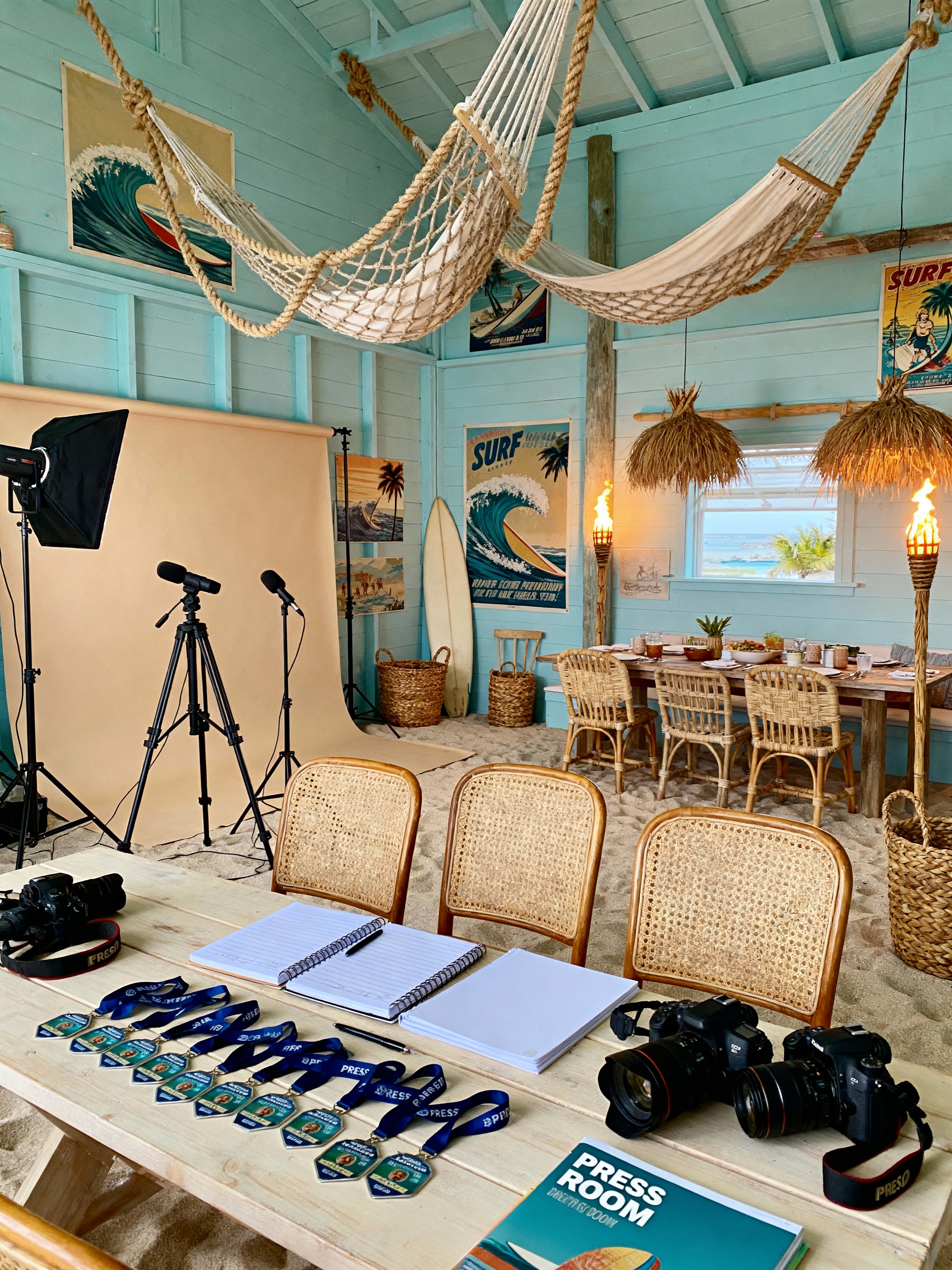 press room with surf shack style with tripods and microphones and backdrop and notebooks and chairs and lighting equipment and cameras and press badges. . with relaxed atmosphere and beach vibes and hammocks and rope details and vintage surf posters and casual dining and tiki torches and woven baskets