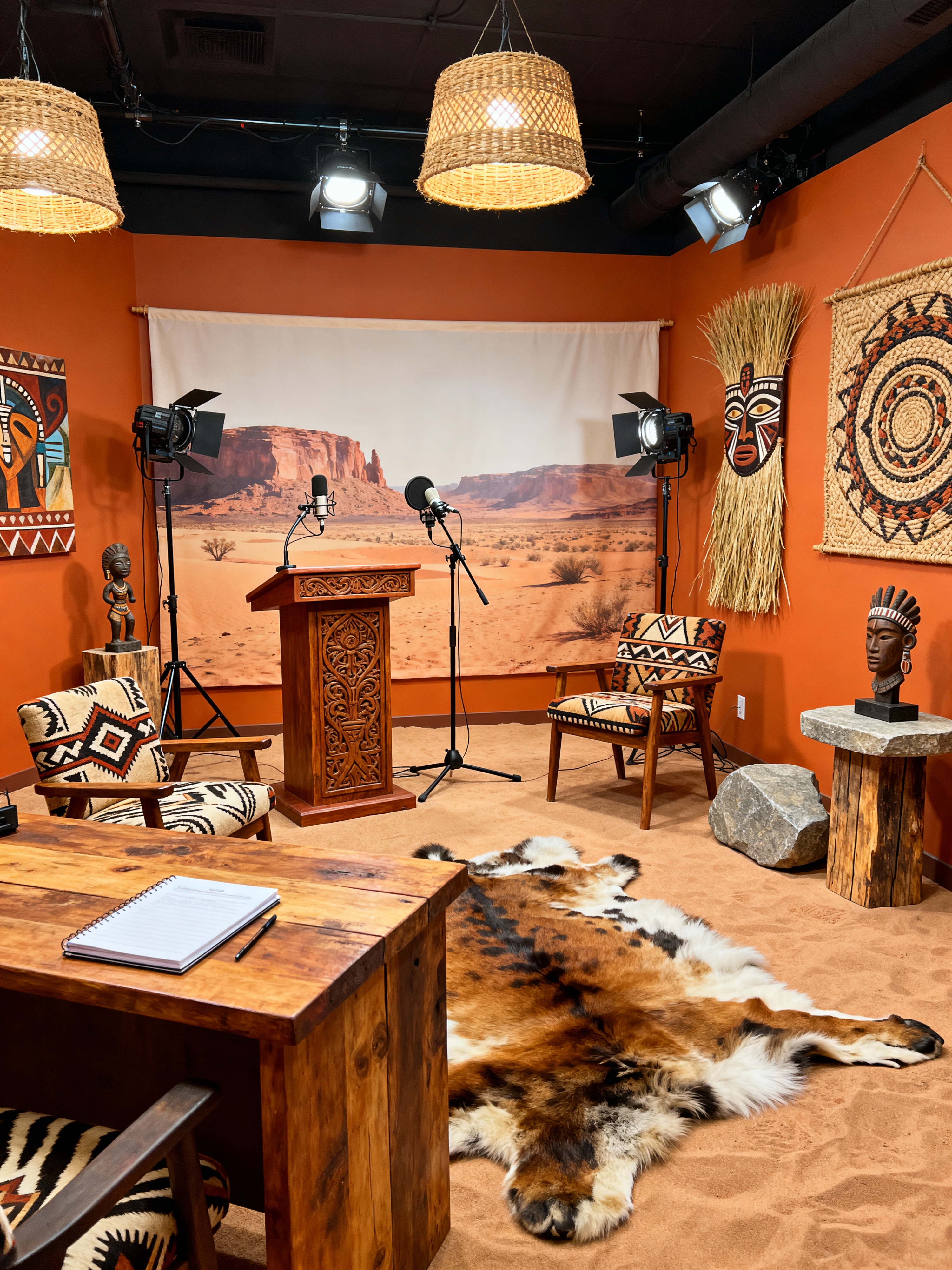 press room with tribal style with notebooks and chairs and podium and backdrop and microphones and recording equipment and lighting equipment and press badges. . with sculptures and artworks and planks of stone and intricate grass weaving and desert colours and smooth worn timbers and animal prints and animal furslinen and tribal revival