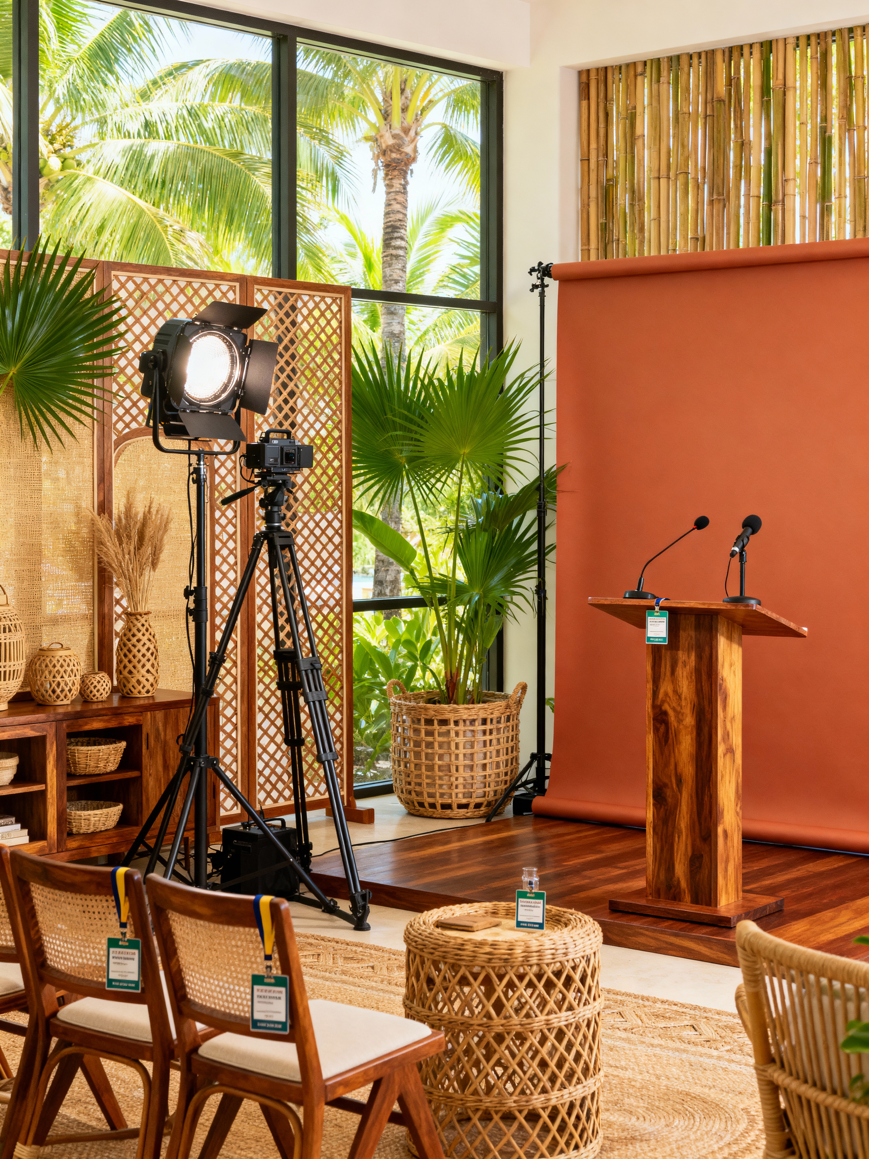press room with tropical style with tripods and backdrop and podium and press badges and chairs and lighting equipment and microphones and recording equipment. . with cane motifs and palm leaves and wicker and rattan and lattice prints and palm trees and bamboo and teak