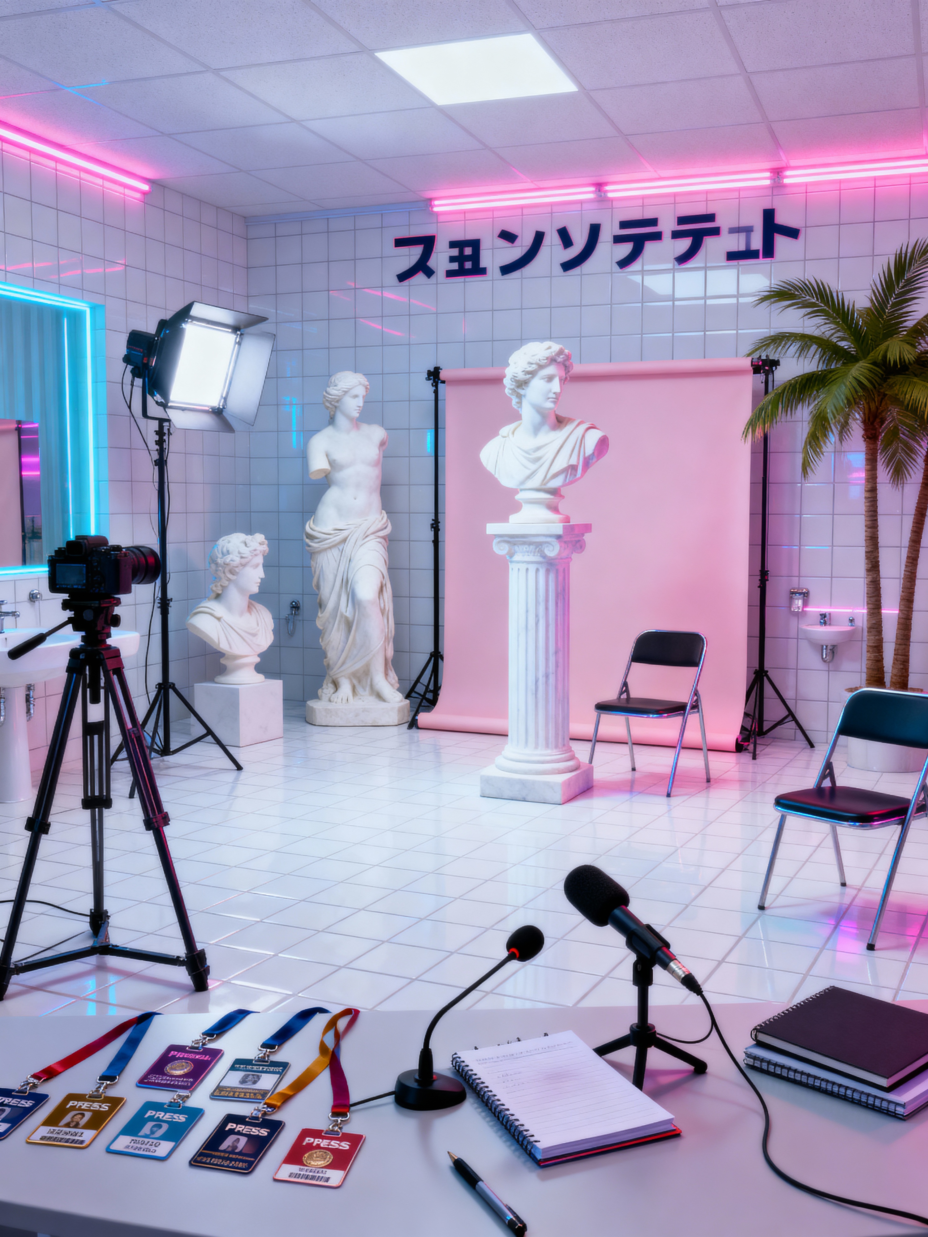 press room with vaporwave style with tripods and cameras and microphones and notebooks and backdrop and chairs and lighting equipment and press badges. . with white square bathroom tiles and neon glow and white roman statues, white roman sculptures, white roman columns, white roman pillars in the center of the room, and japanese letters on wall and palm trees and japanese letters on wall and washed out colors and neon glow