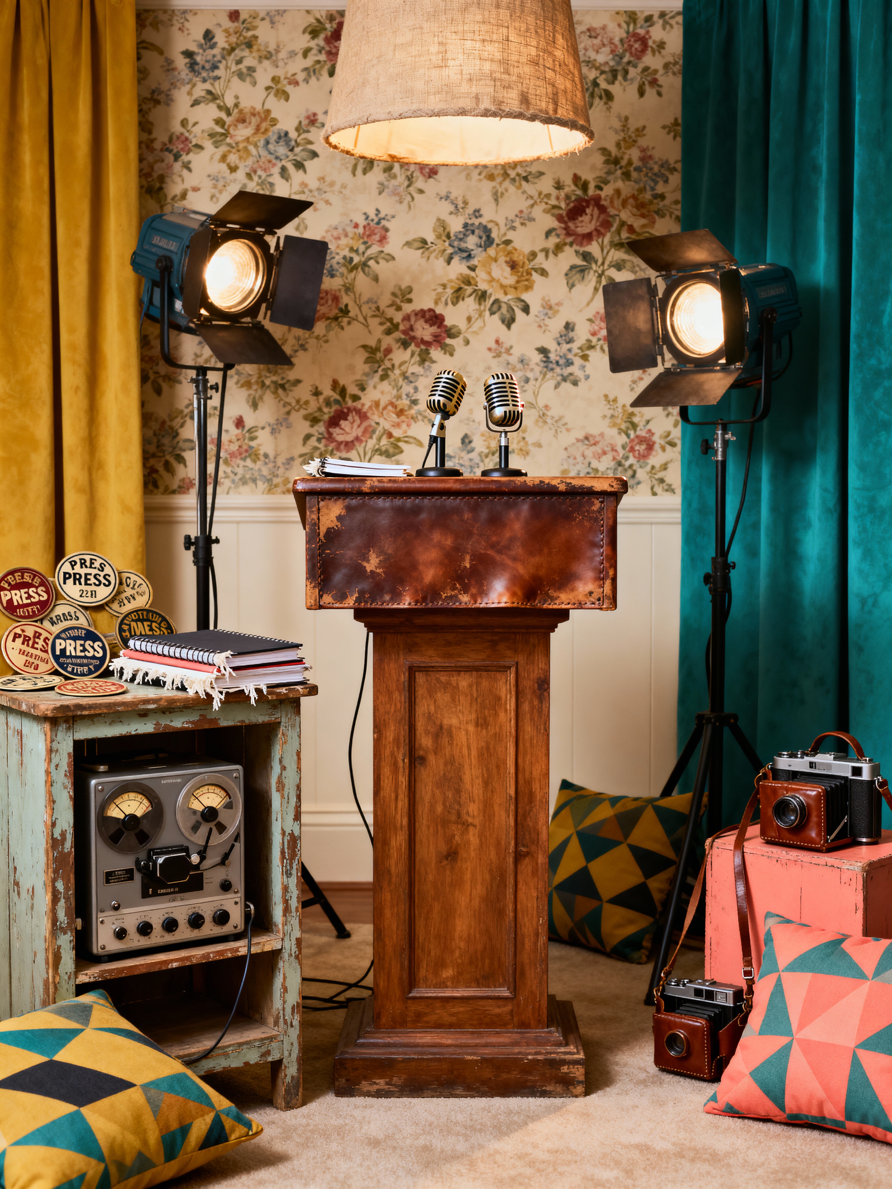 press room with vintage style with podium and backdrop and press badges and notebooks and microphones and recording equipment and lighting equipment and cameras. . with shabby chic and bold patterns and colorful accents and nostalgic feel and upcycled furniture and eclectic and retro style and antique decor