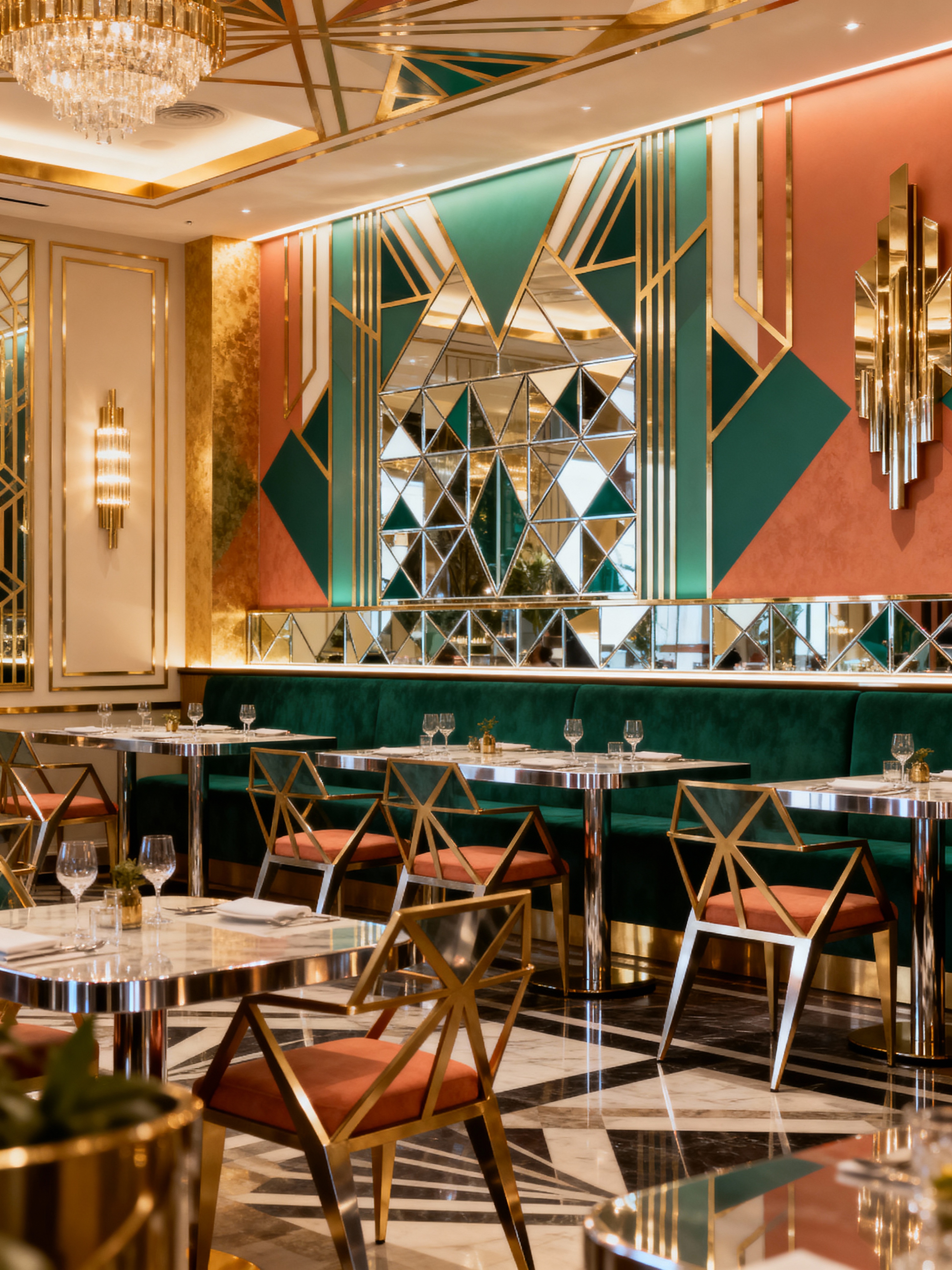 restaurant with art deco style with restaurant decor and restaurant chairs and restaurant bar and restaurant dining tables and restaurant decor. . with geometric lines and glamour and bright and cheerful colors and exuberant shapes and bold geometry and decadent detail and luxury and abstract patterns