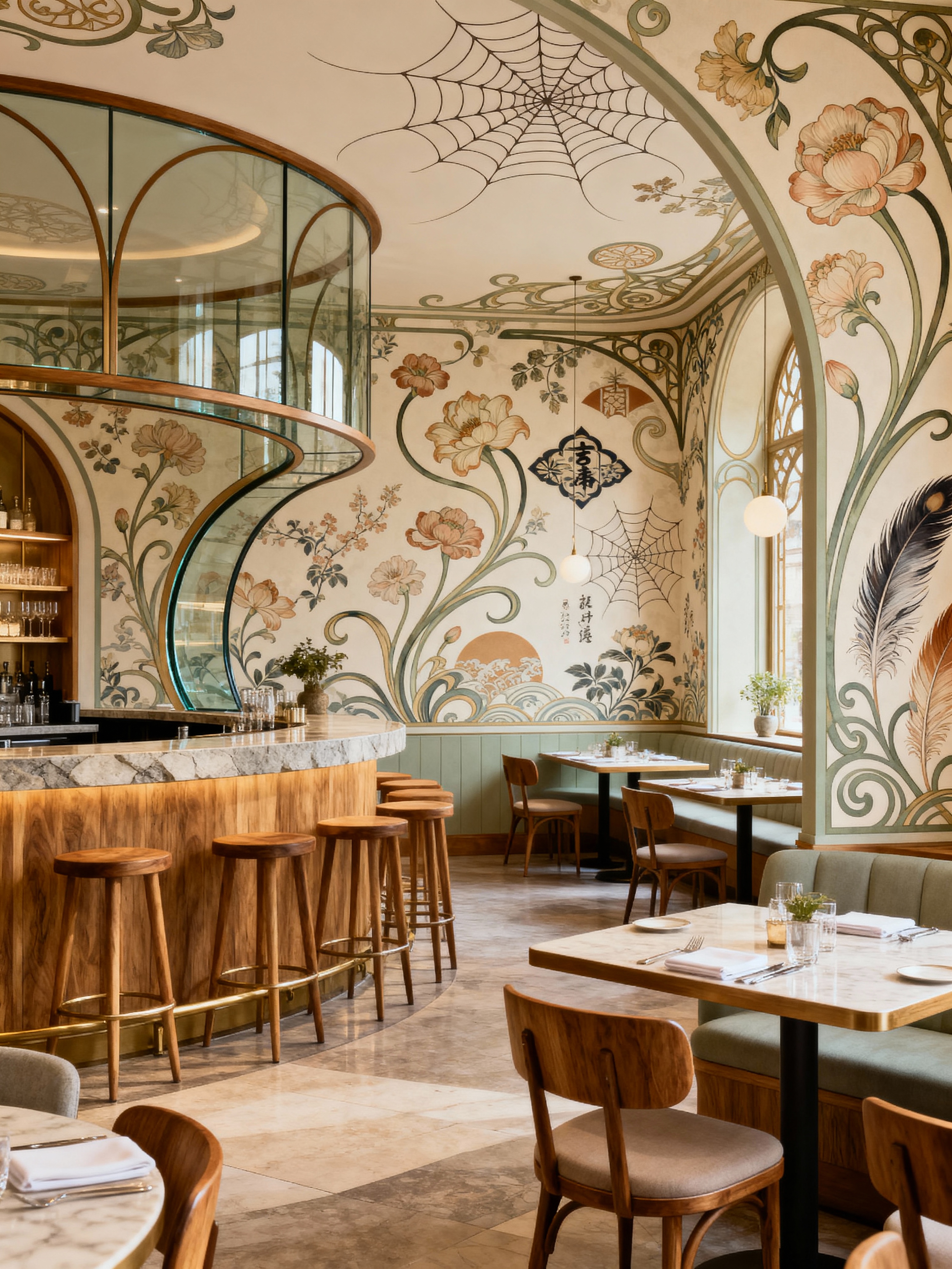 restaurant with art nouveau style with restaurant bar and restaurant dining tables and restaurant chairs and restaurant decor and restaurant bar. . with wallpaper patterns of stylized flowers and curving, plant-like embellishments and natural materials and wallpaper pattners of spider webs and japanese motifs and soft, rounded lines and curved glass and wallpaper patterns of feathers
