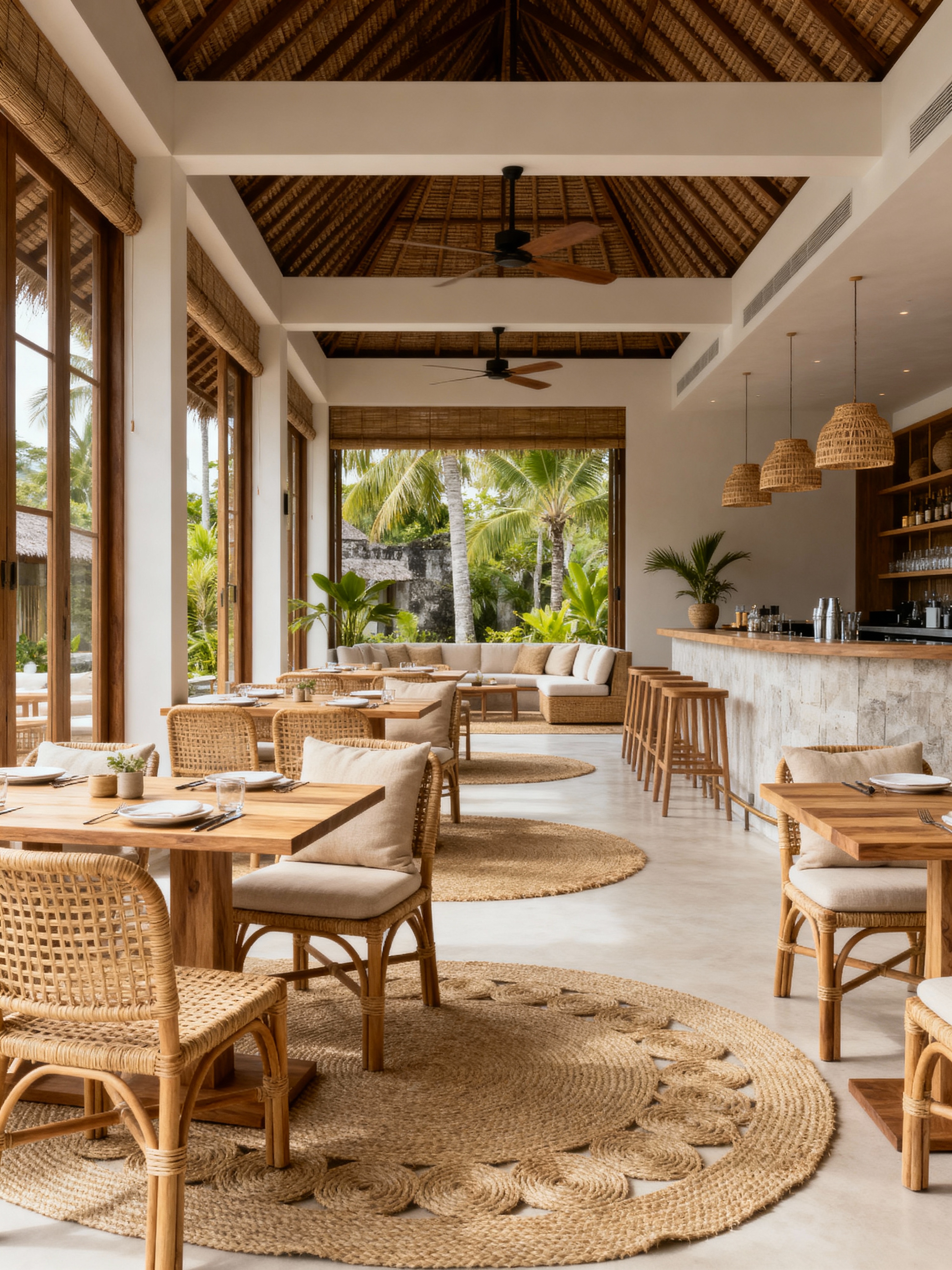 restaurant with bali style with restaurant chairs and restaurant dining tables and restaurant decor and restaurant bar and restaurant chairs. . with calm, minimal, tropical atmosphere and neutral color palette and modern boho chic and rattan chairs and decor and light wood furniture (teak, oak) and open high ceilings with fans and beige and sand tone cushions and woven rugs (jute, seagrass)