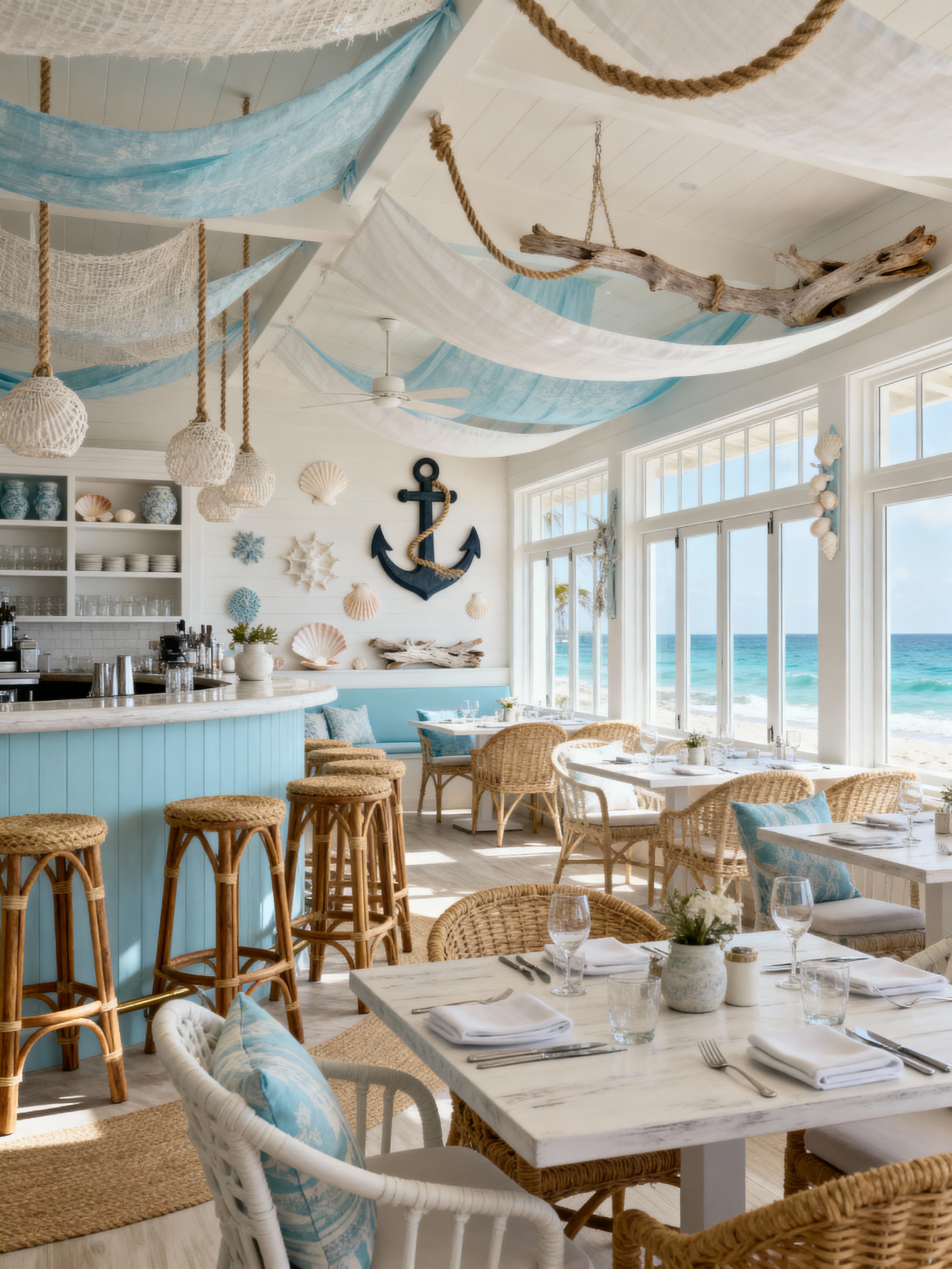 restaurant with coastal style with restaurant decor and restaurant bar and restaurant dining tables and restaurant chairs and restaurant decor. . with natural materials and white decor and light blue and nautical decor and seaside colors and airy feel and ocean-inspired and relaxed style
