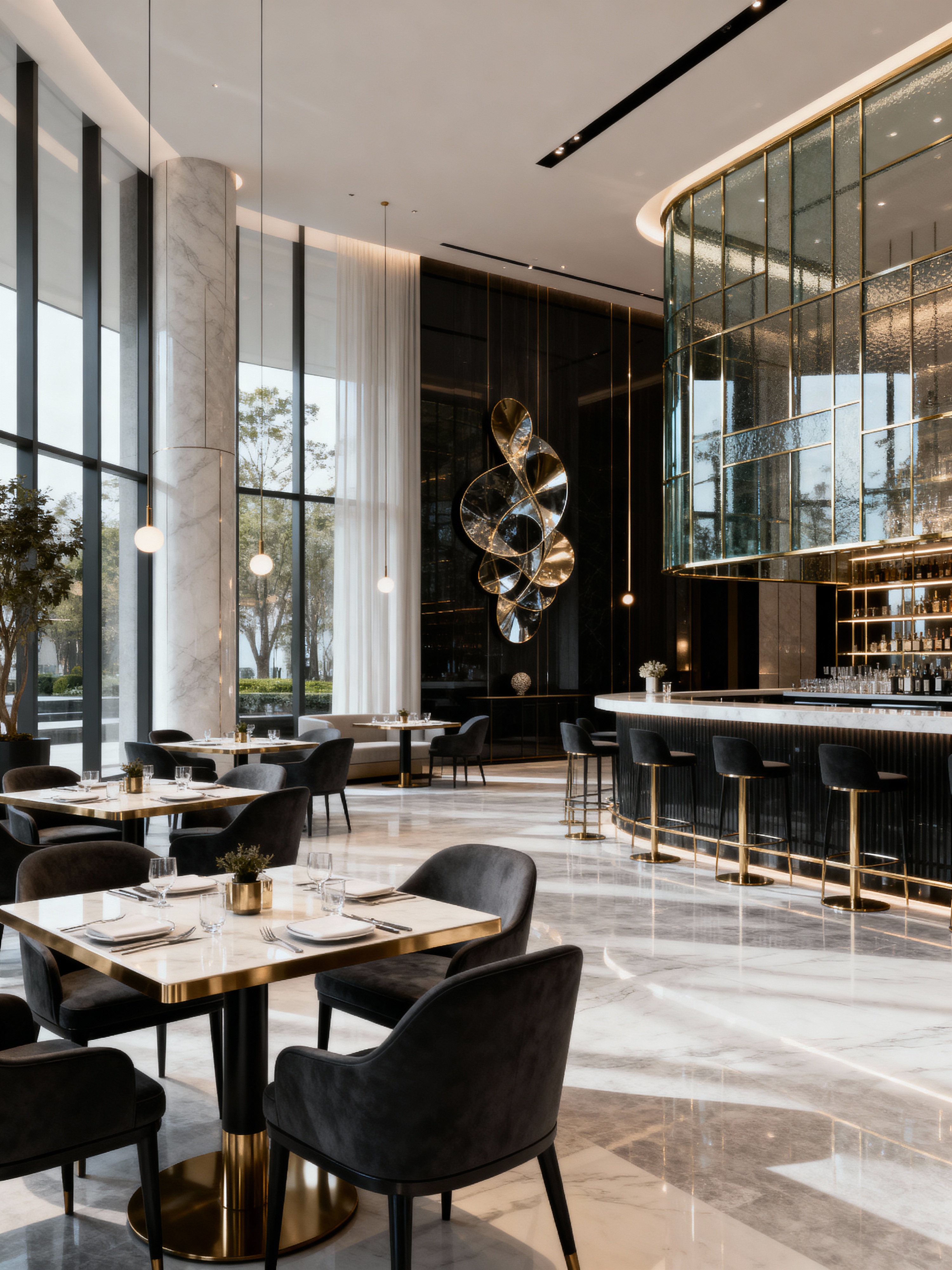 restaurant with contemporary style with restaurant dining tables and restaurant chairs and restaurant bar and restaurant decor and restaurant dining tables. . with elegant simplicity and metal accents and glass decor and sleek lines and high contrast and modern finishes and neutral palette and open spaces