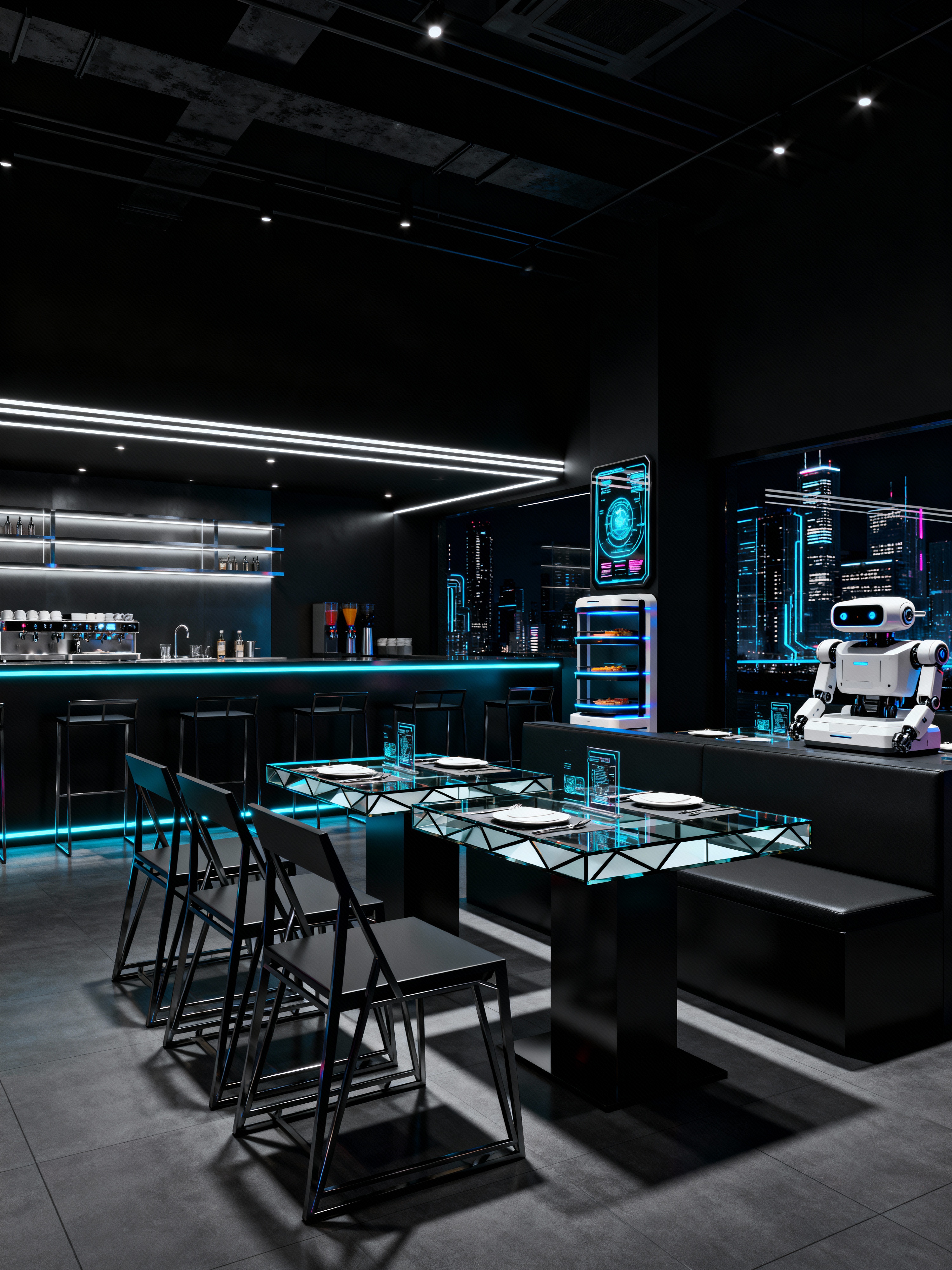 restaurant with cyberpunk style with restaurant chairs and restaurant bar and restaurant dining tables and restaurant decor and restaurant chairs. . with clean straight square lines and synthwave and black lights and cyberpunk style and dark night and futuristic cybernetic city and minimalist and futuristic cybernetic details