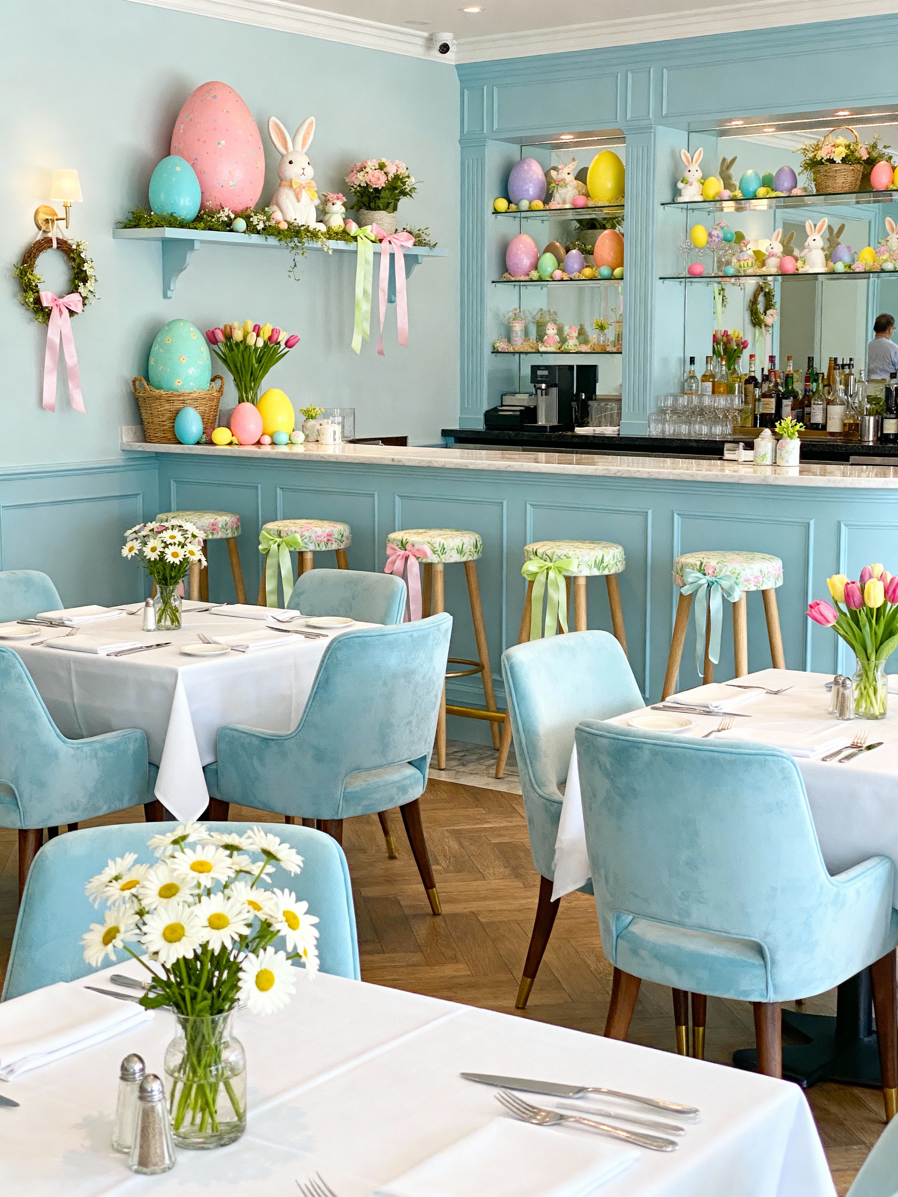 restaurant with easter style with restaurant chairs and restaurant decor and restaurant dining tables and restaurant bar and restaurant chairs. . with light blue colors and flowers on table and easter decorations and colorful easter eggs and spring decorations and light blue colors