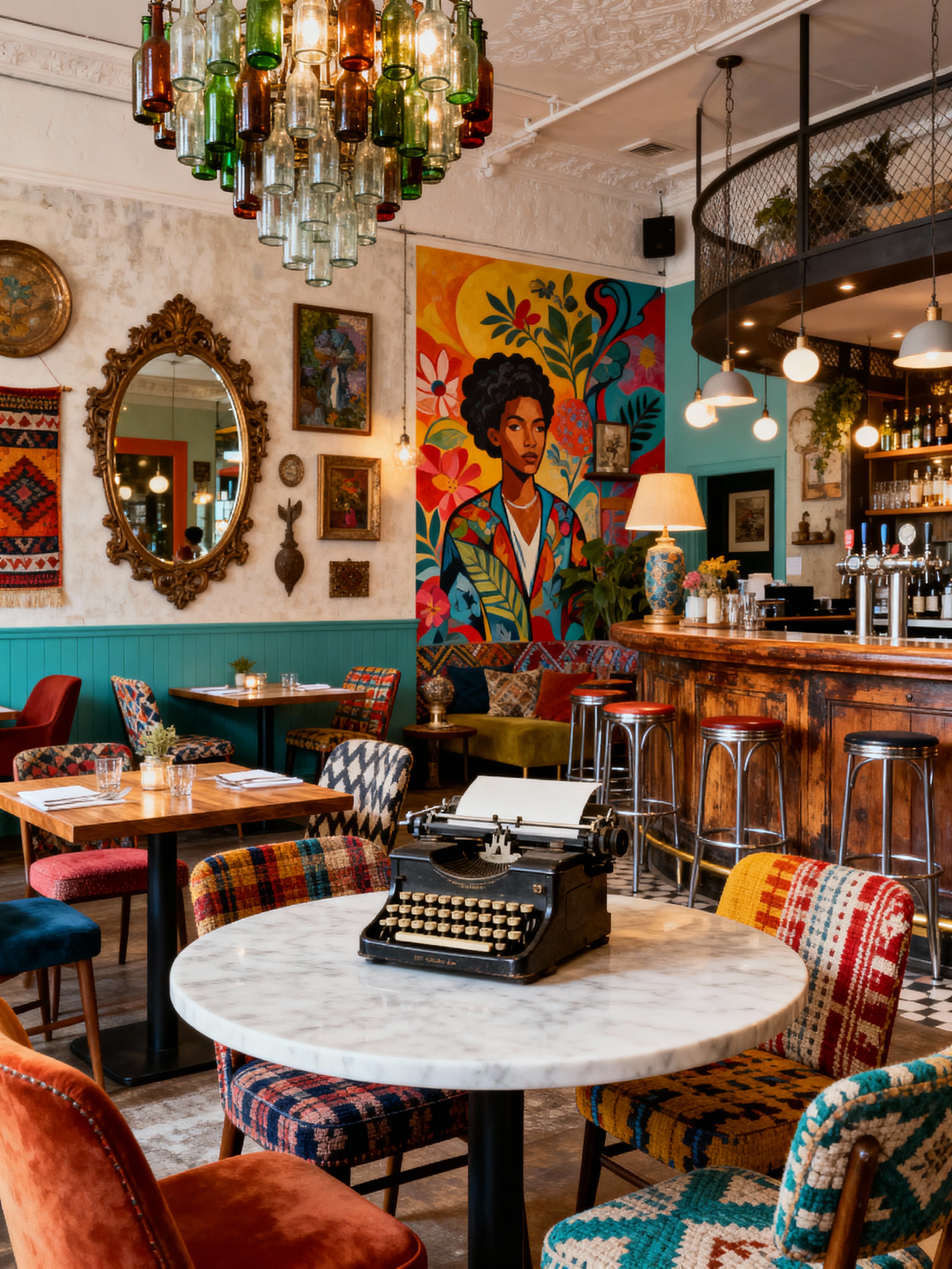 restaurant with eclectic style with restaurant dining tables and restaurant chairs and restaurant bar and restaurant decor and restaurant dining tables. . with colorful palette and unique pieces and mixed styles and bold combinations and vintage finds and personal expression and artistic flair and unexpected elements