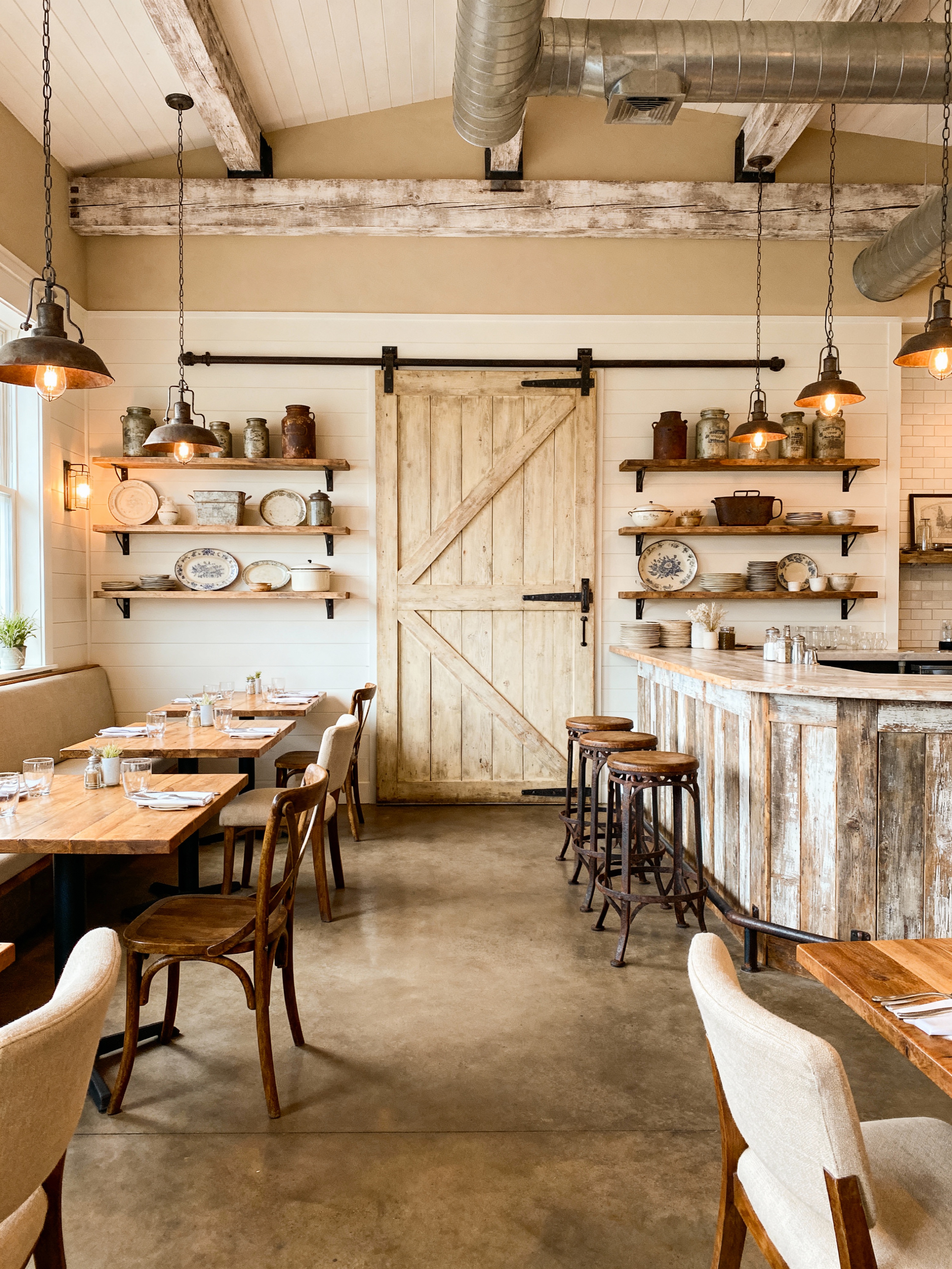 restaurant with farmhouse style with restaurant decor and restaurant bar and restaurant chairs and restaurant dining tables and restaurant decor. . with rustic charm and open shelving and industrial accents and exposed wood and neutral tones and vintage decor and barn doors and cozy feel