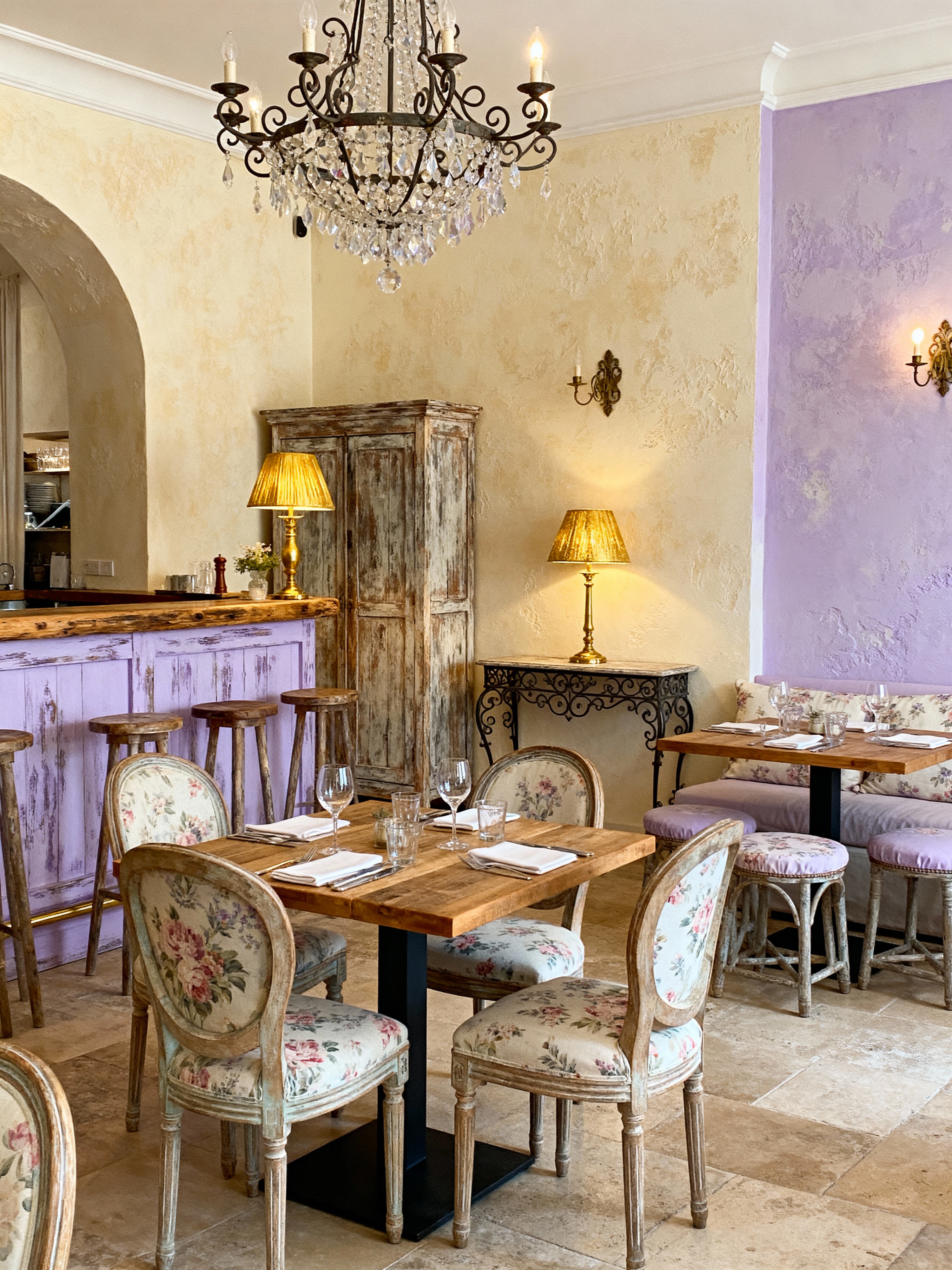 restaurant with french country style with restaurant decor and restaurant bar and restaurant chairs and restaurant dining tables and restaurant decor. . with distressed wood and lavender accents and vintage furniture and textured walls and chandeliers and warm tones and soft fabrics and country elegance