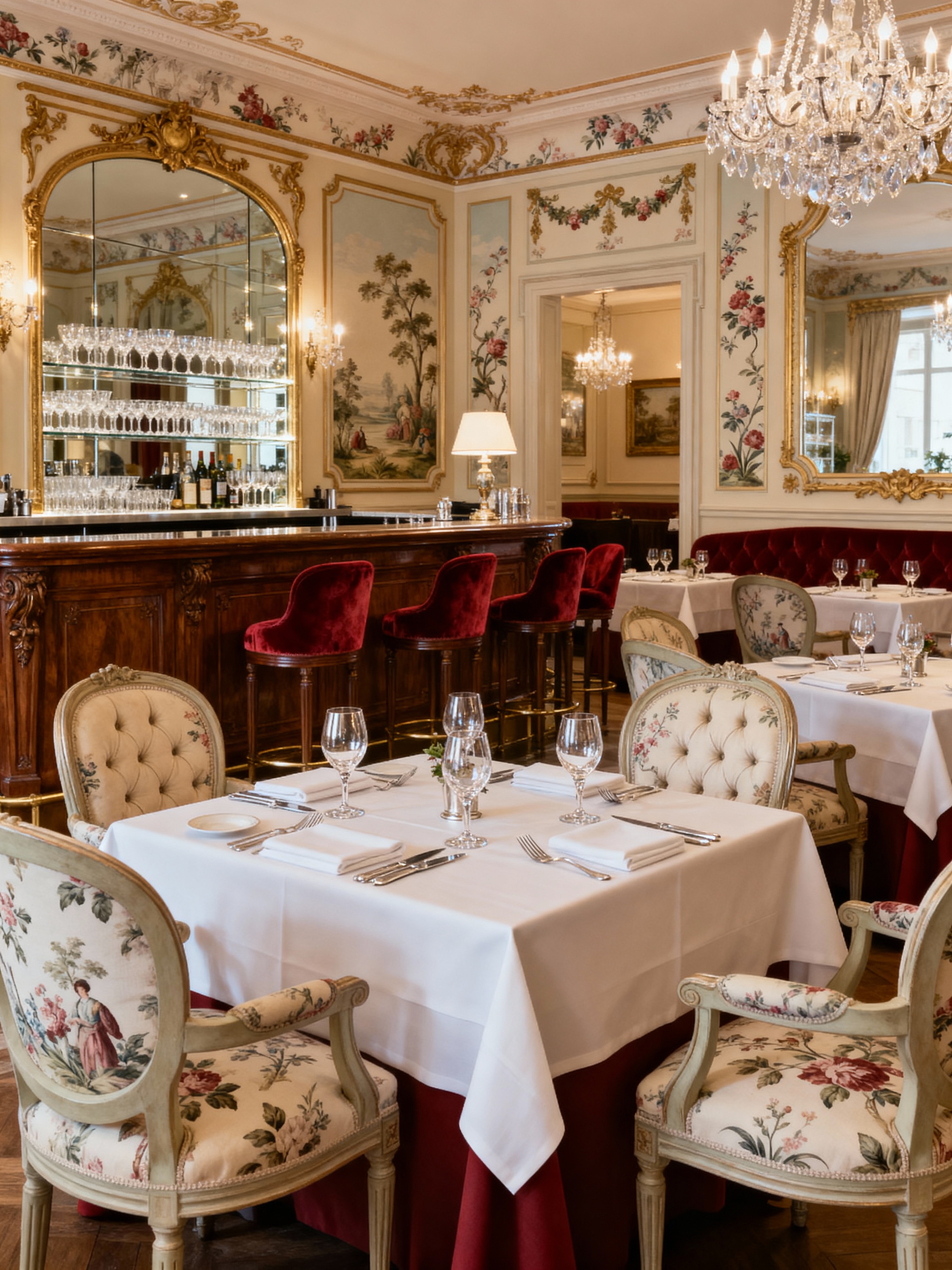 restaurant with french style with restaurant dining tables and restaurant bar and restaurant chairs and restaurant decor and restaurant dining tables. . with toile patterns and romantic style and crystal accents and antique pieces and refined luxury and ornate furniture and elegant details and classic beauty