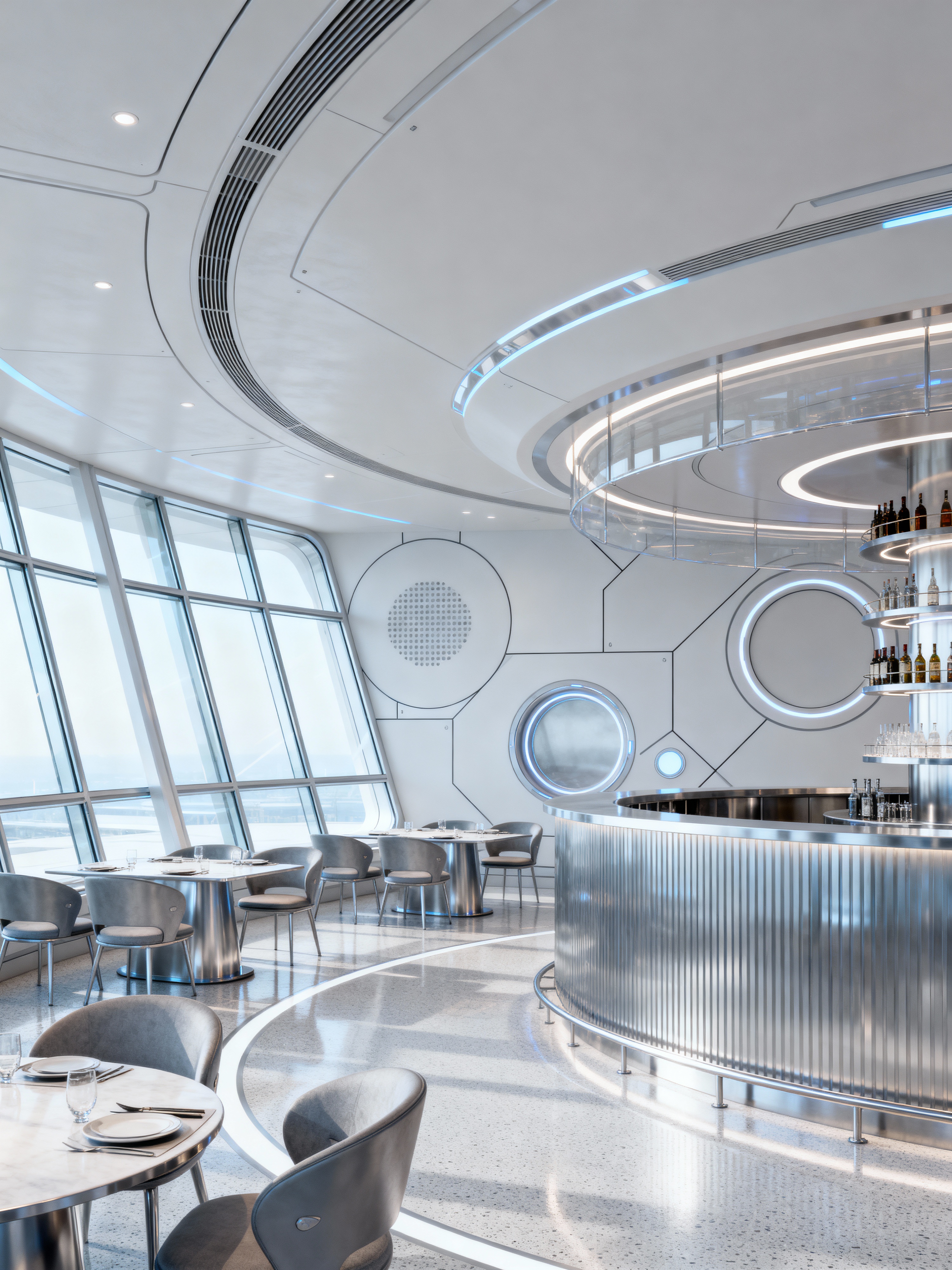 restaurant with futuristic style with restaurant decor and restaurant chairs and restaurant dining tables and restaurant bar and restaurant decor. . with minimalist clean lines and spaceship interior and strong geometric walls and glass panes and light colors and circular shapes and futurism and steel finishing