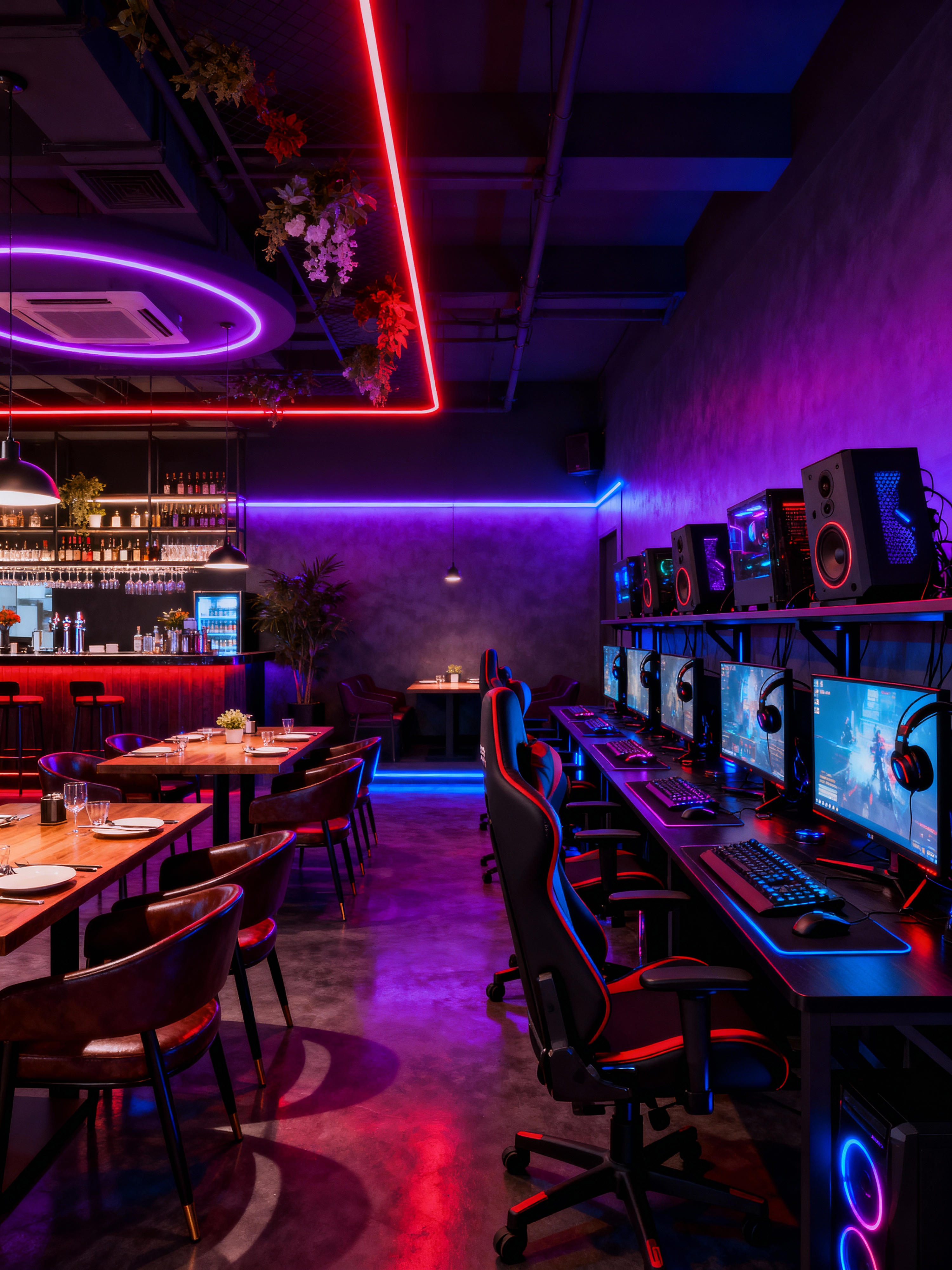 restaurant with gaming room style with restaurant dining tables and restaurant bar and restaurant chairs and restaurant decor and restaurant dining tables. . with speakers and purple, red and blue fade light and gaming chair and computer desk with computer displays and keyboard and purple and red lights and at night and dark room and neon lights