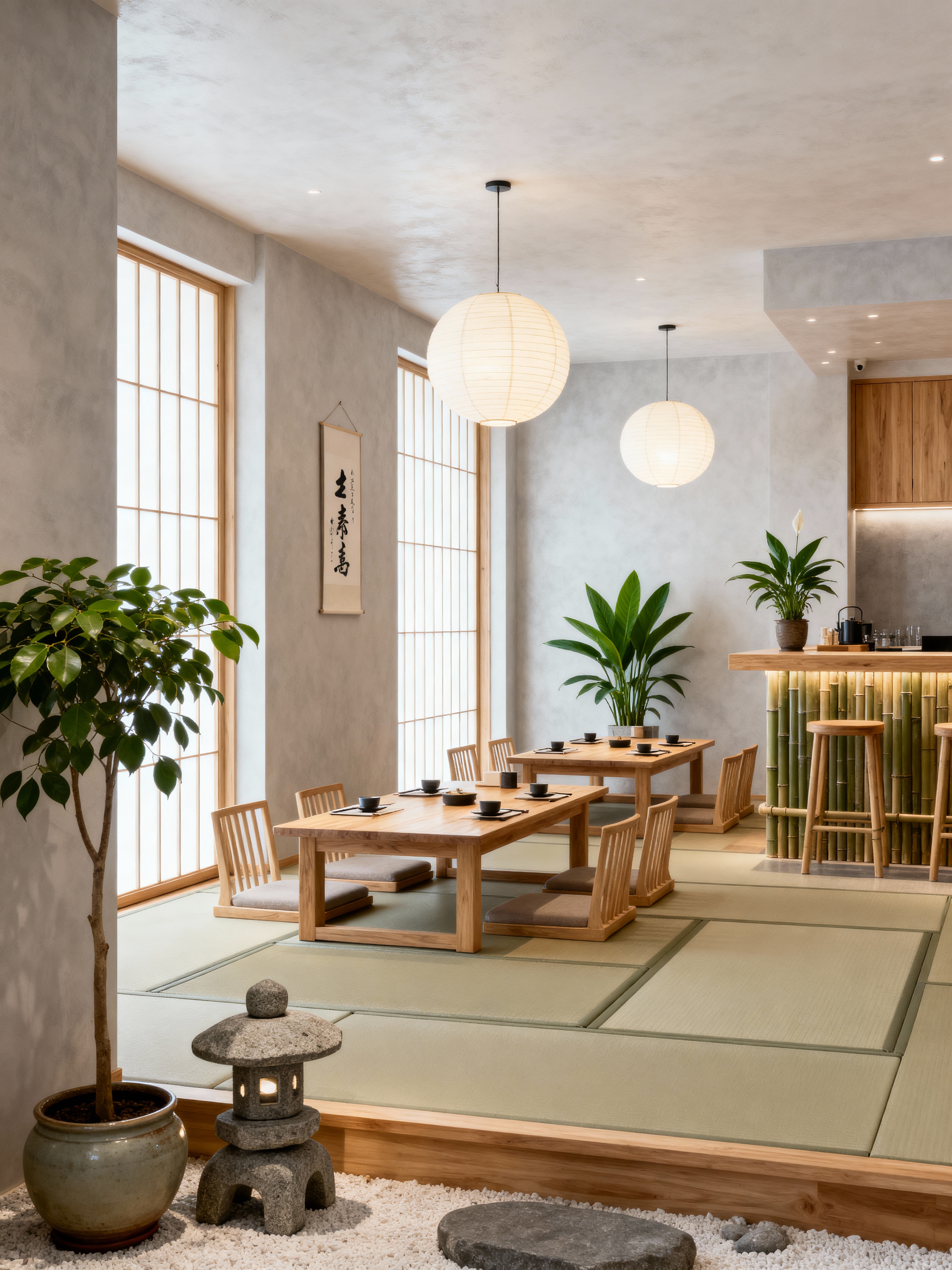 restaurant with japanese design style with restaurant decor and restaurant dining tables and restaurant chairs and restaurant bar and restaurant decor. . with tranquility and indoor plants and bamboo accents and tatami mats and neutral colors and low furniture and zen decor and natural materials