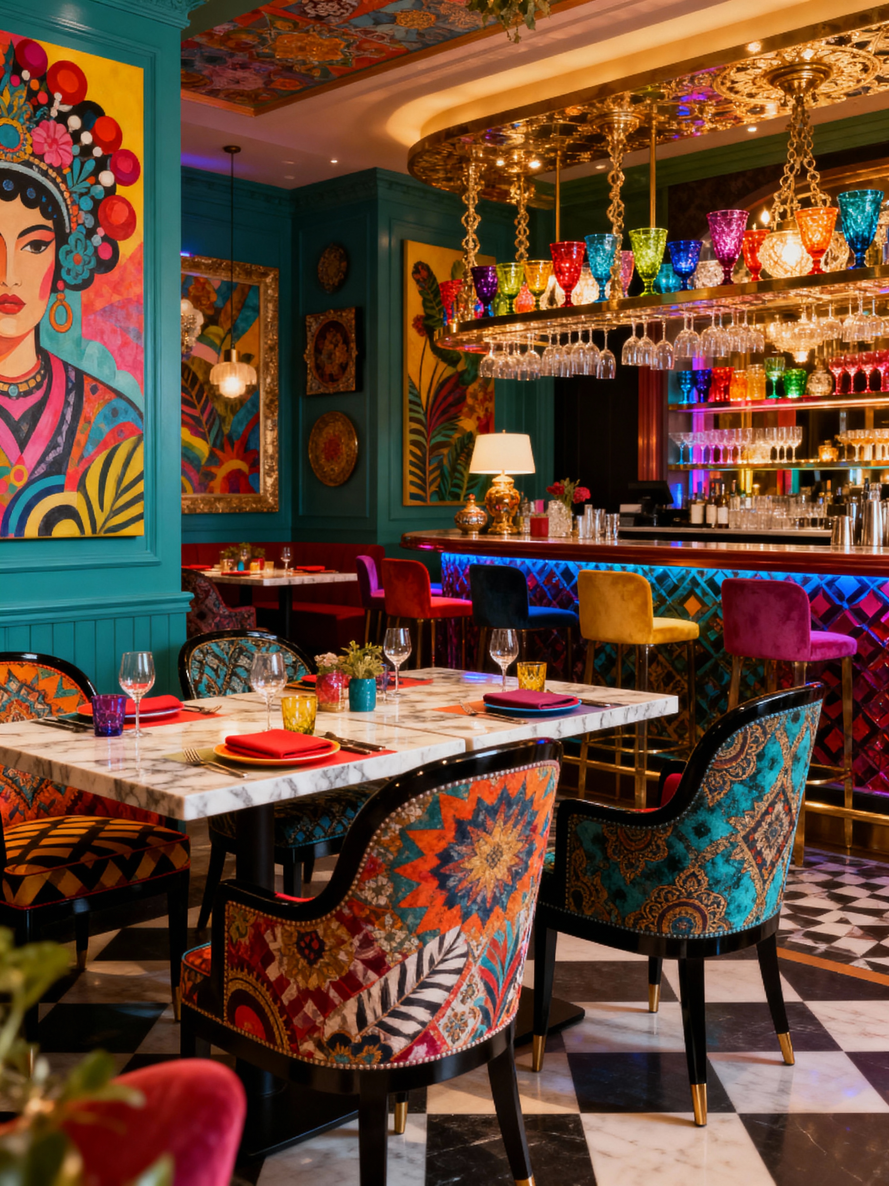 restaurant with maximalist style with restaurant chairs and restaurant decor and restaurant bar and restaurant dining tables and restaurant chairs. . with more is more philosophy and bold patterns and bold creativity and over-the-top aesthetic and eye-catching and bold colors and bold design and playful