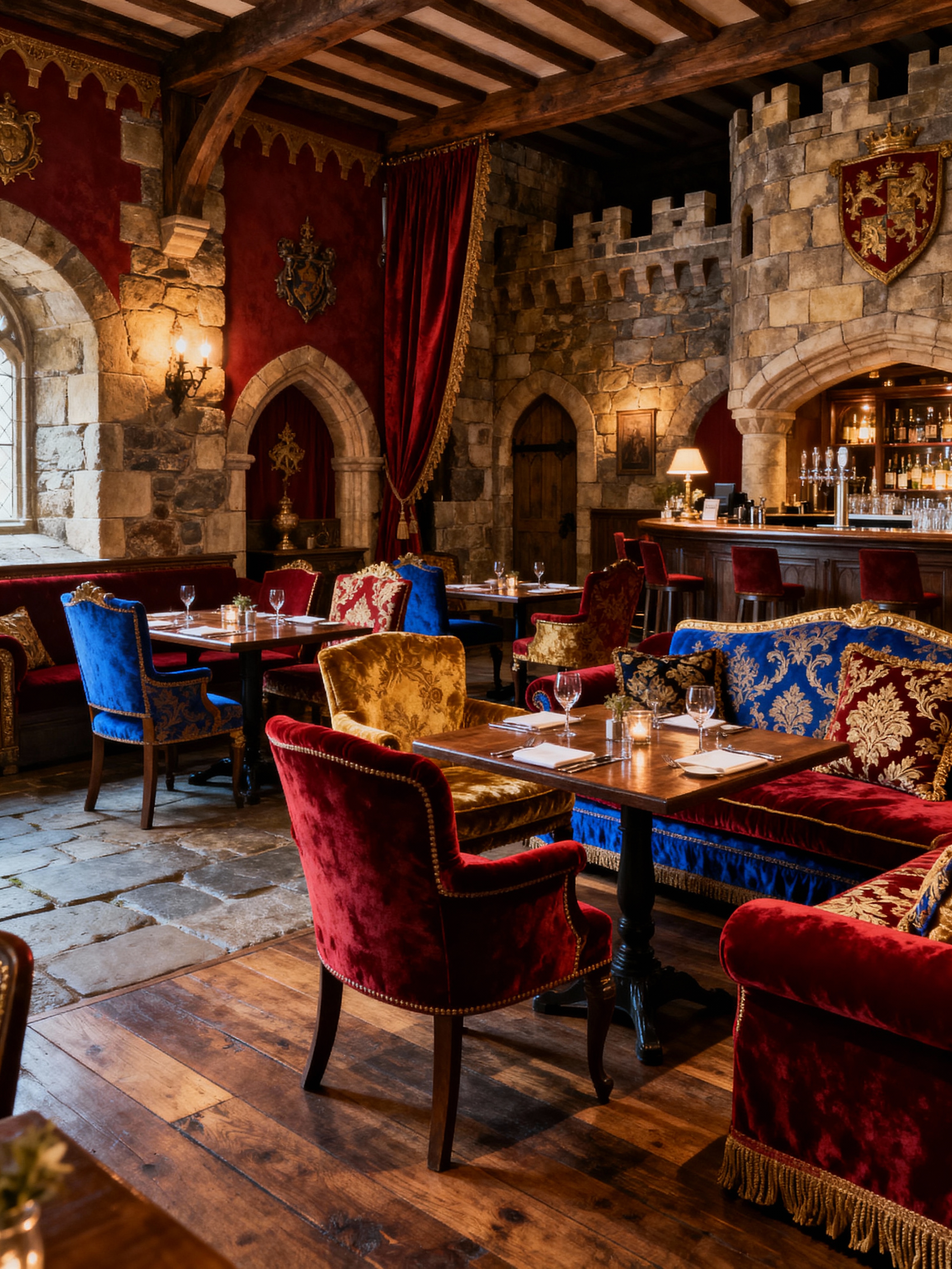 restaurant with medieval style with restaurant decor and restaurant chairs and restaurant bar and restaurant dining tables and restaurant decor. . with castle interior and stone or wooden floor and velvet, chenille, damask, and brocade draperies and fabrics and timber walls and stone walls and heavy furniture pieces and deep colors like red, gold, or blue and upholstery on chairs and sofas
