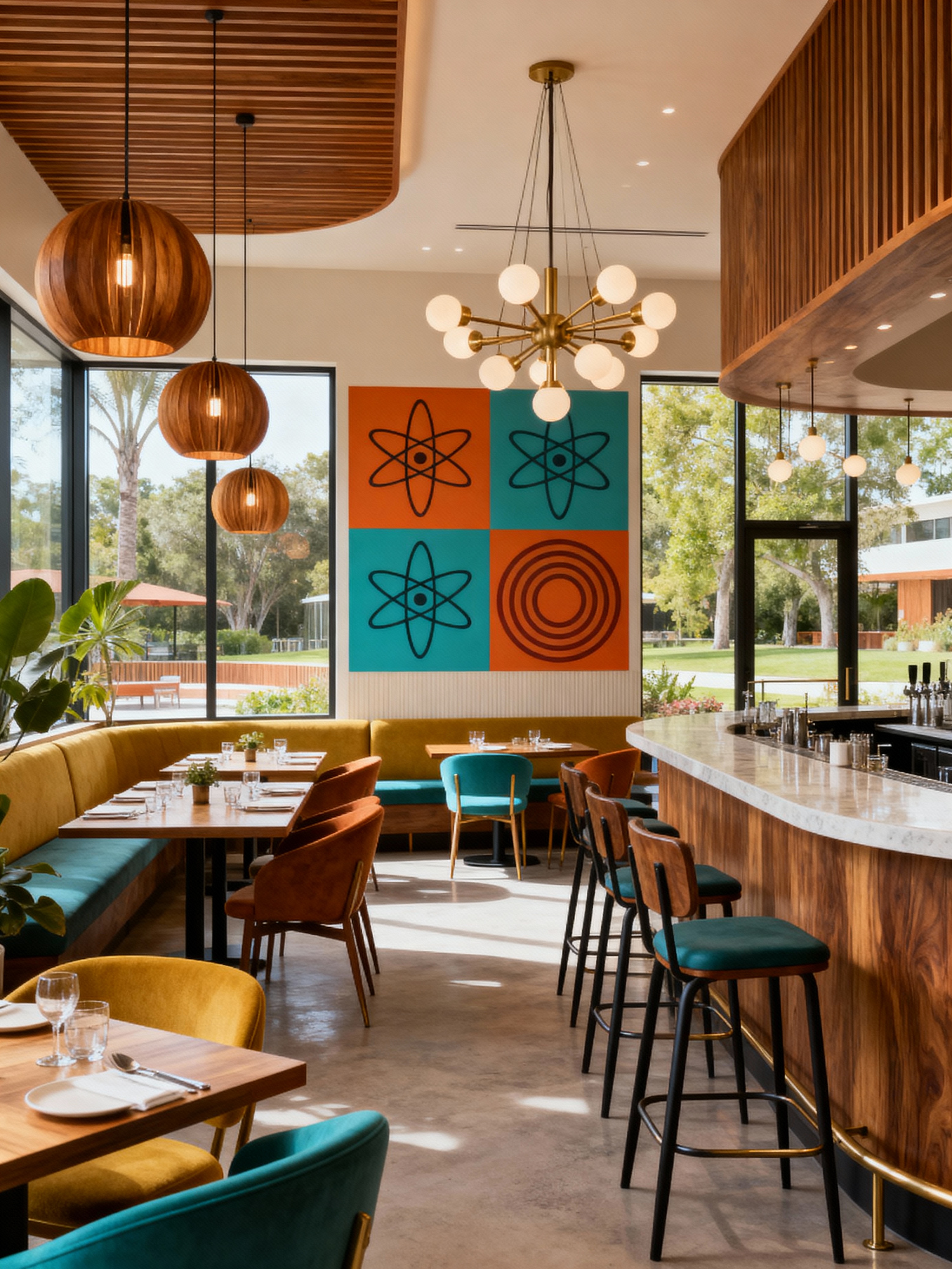 restaurant with midcentury modern style with restaurant dining tables and restaurant bar and restaurant decor and restaurant chairs and restaurant dining tables. . with function over form and wood pendant light mid century modern chandelier and integrating indoor and outdoor motifs and natural and manmade materials and vibrant colors and graphic shapes and clean lines and organic and geometric shapes
