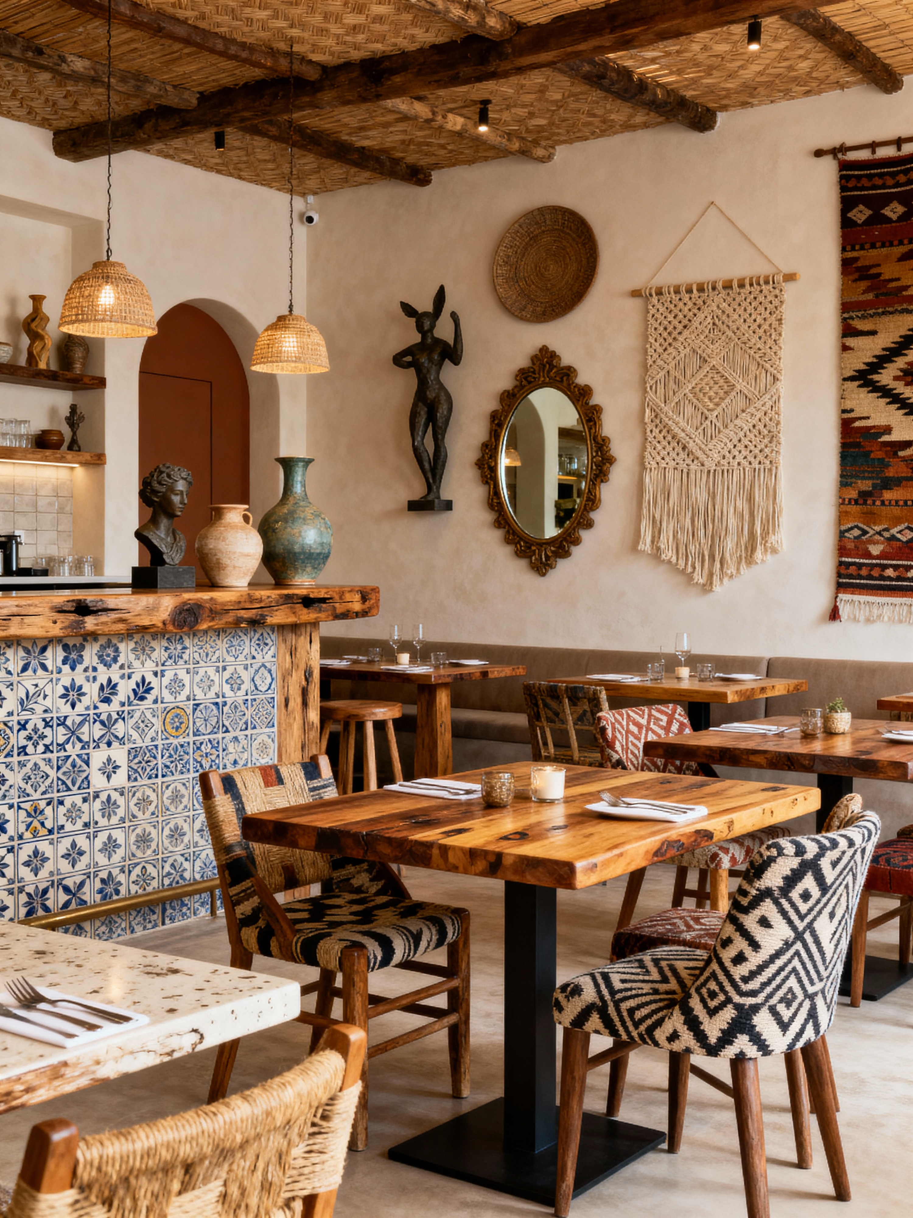 restaurant with modern boho style with restaurant decor and restaurant dining tables and restaurant chairs and restaurant bar and restaurant decor. . with handcrafted items and artistic decor and natural materials and warm colors and earthy tones and expressive decor and collected look and unique finds