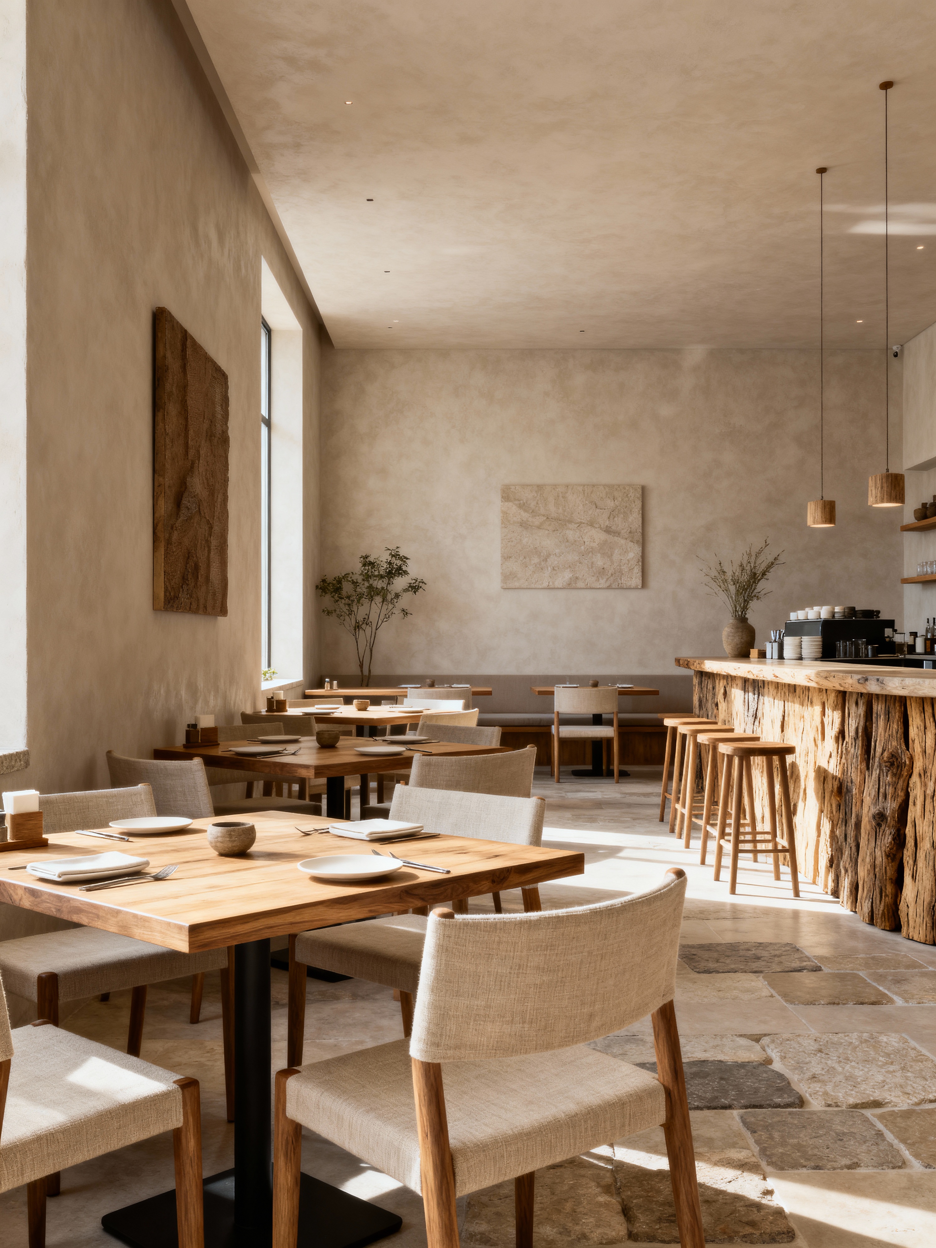 restaurant with modern style with restaurant chairs and restaurant dining tables and restaurant decor and restaurant bar and restaurant chairs. . with natural materials and elements and neutral walls and textures and open and natural lighting and simple, clean lines and simplistic furniture and practicality and functionality and natural materials and elements