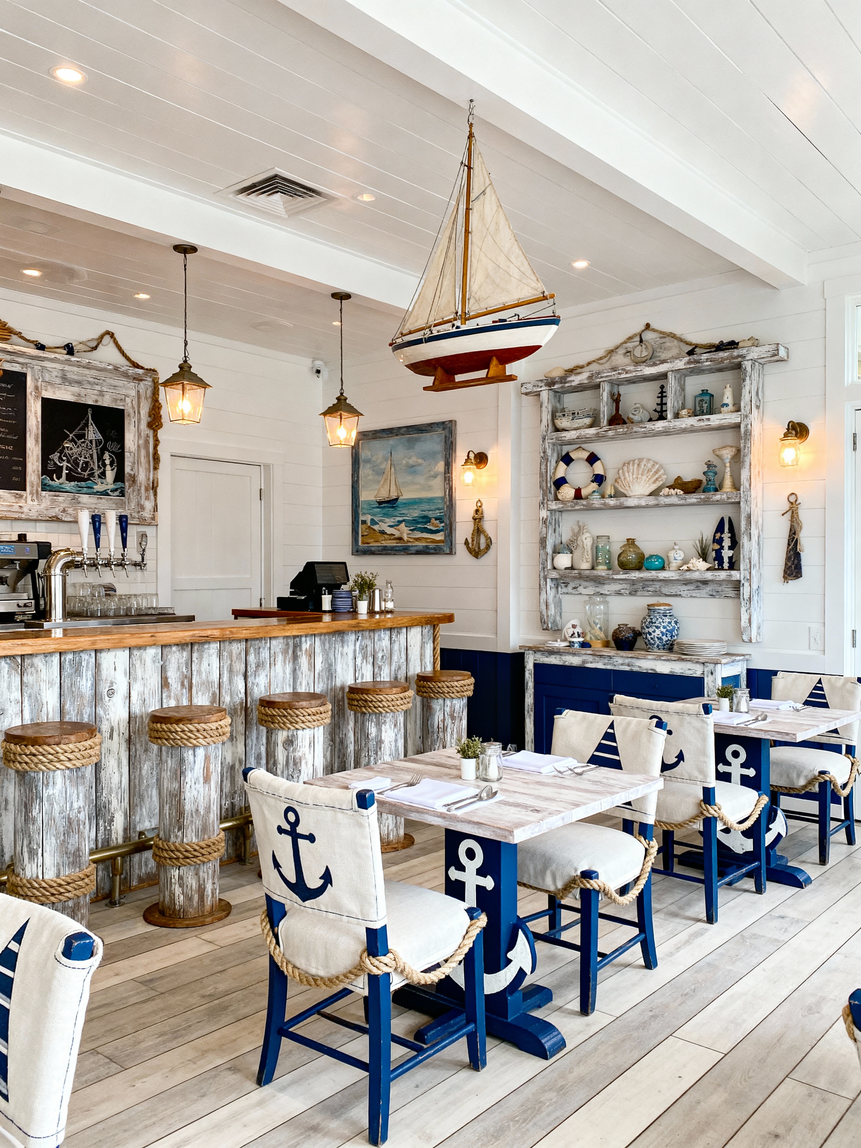 restaurant with nautical style with restaurant bar and restaurant chairs and restaurant dining tables and restaurant decor and restaurant bar. . with sailboat elements and rope details and seaside charm and anchor motifs and maritime decor and weathered wood and crisp white and coastal vibes