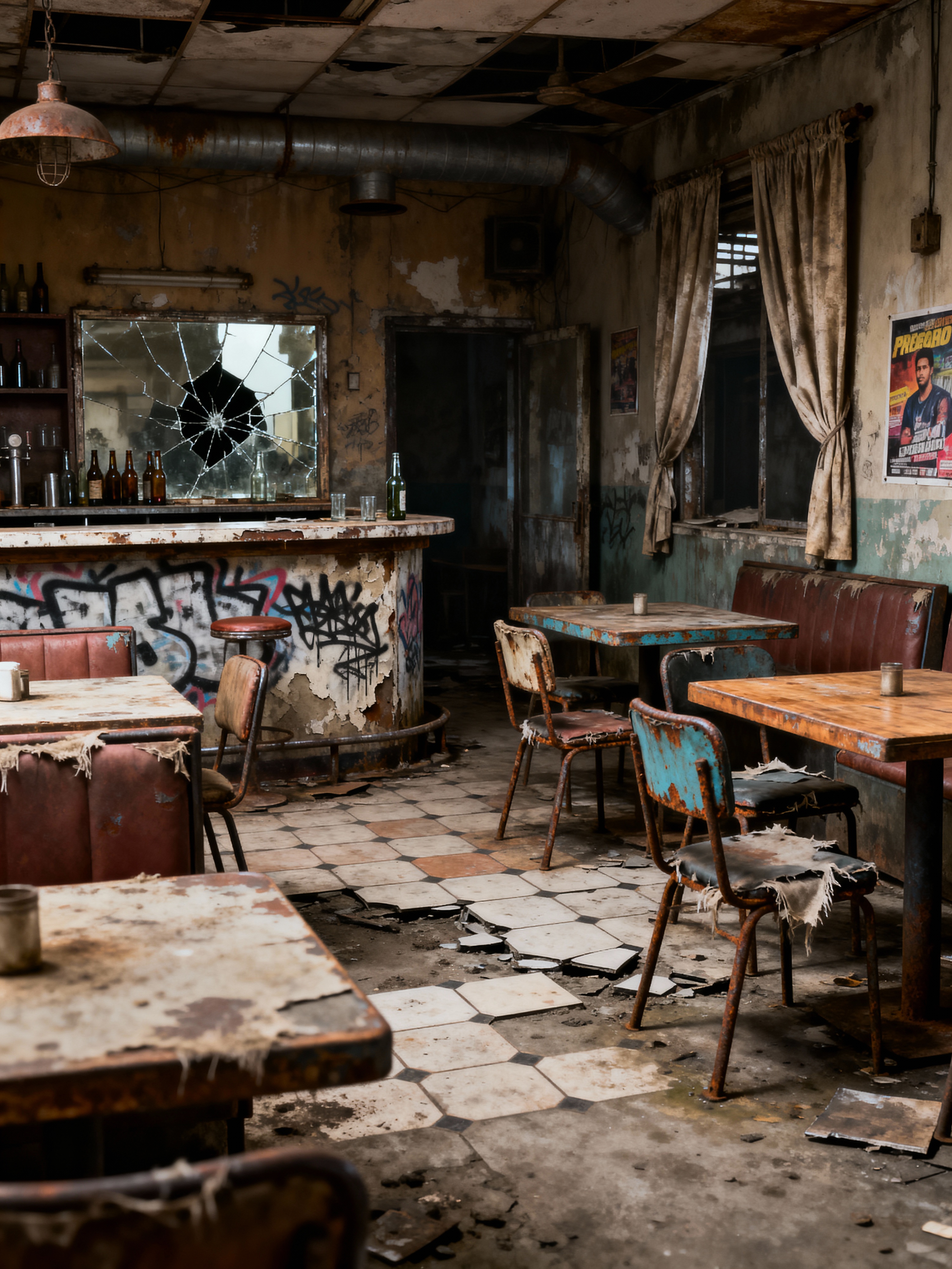 restaurant with post-apocalyptic style with restaurant bar and restaurant dining tables and restaurant decor and restaurant chairs and restaurant bar. . with cheap mismatched furniture and neglected atmosphere and distressed furniture and broken tiles and dirty floor and post-apocalyptic and run-down favela style and abandoned look