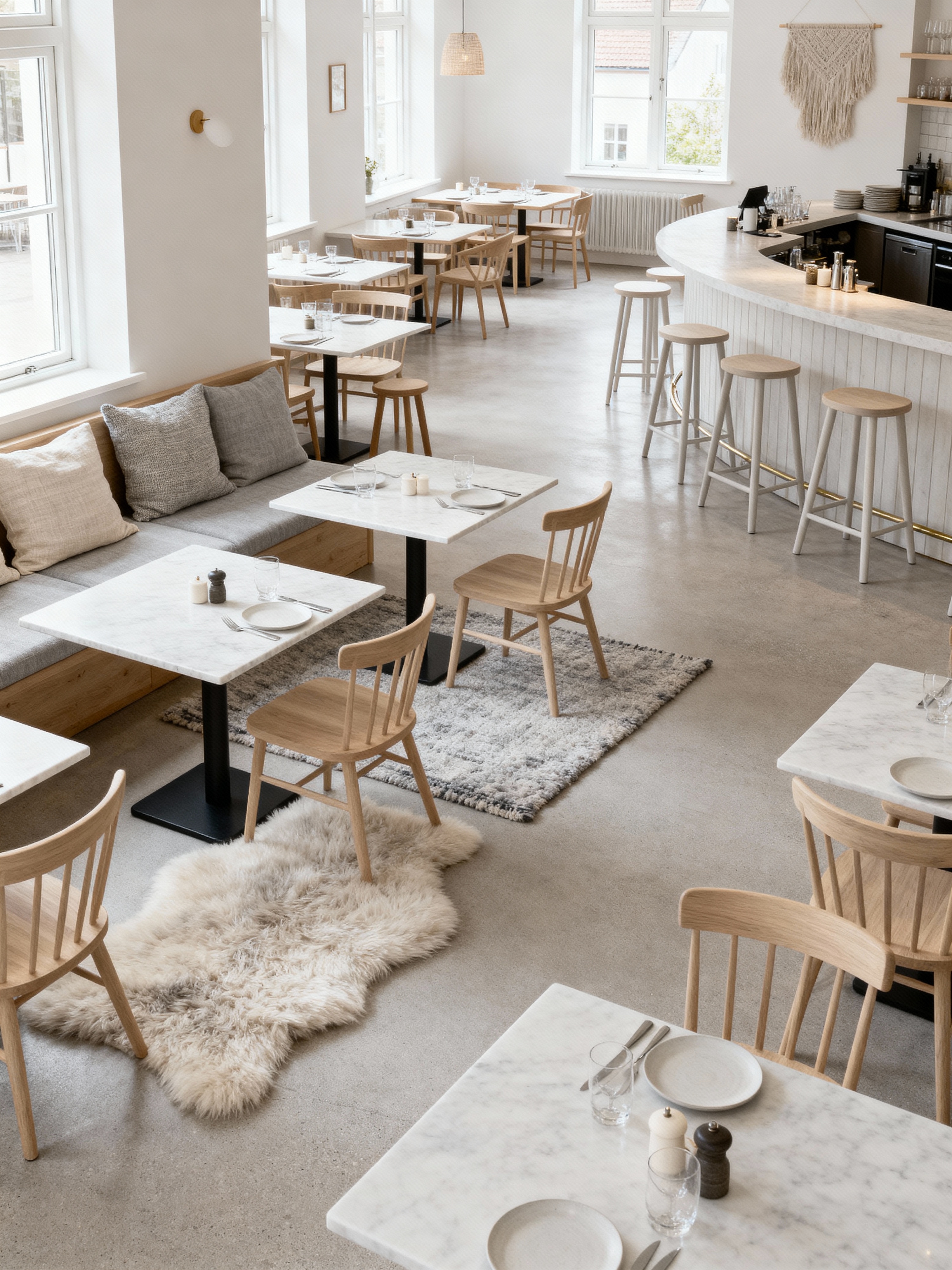restaurant with scandinavian style with restaurant dining tables and restaurant bar and restaurant decor and restaurant chairs and restaurant dining tables. . with cozy atmosphere and clean lines and simple elegance and neutral palette and functional furniture and textured fabrics and natural light and light wood
