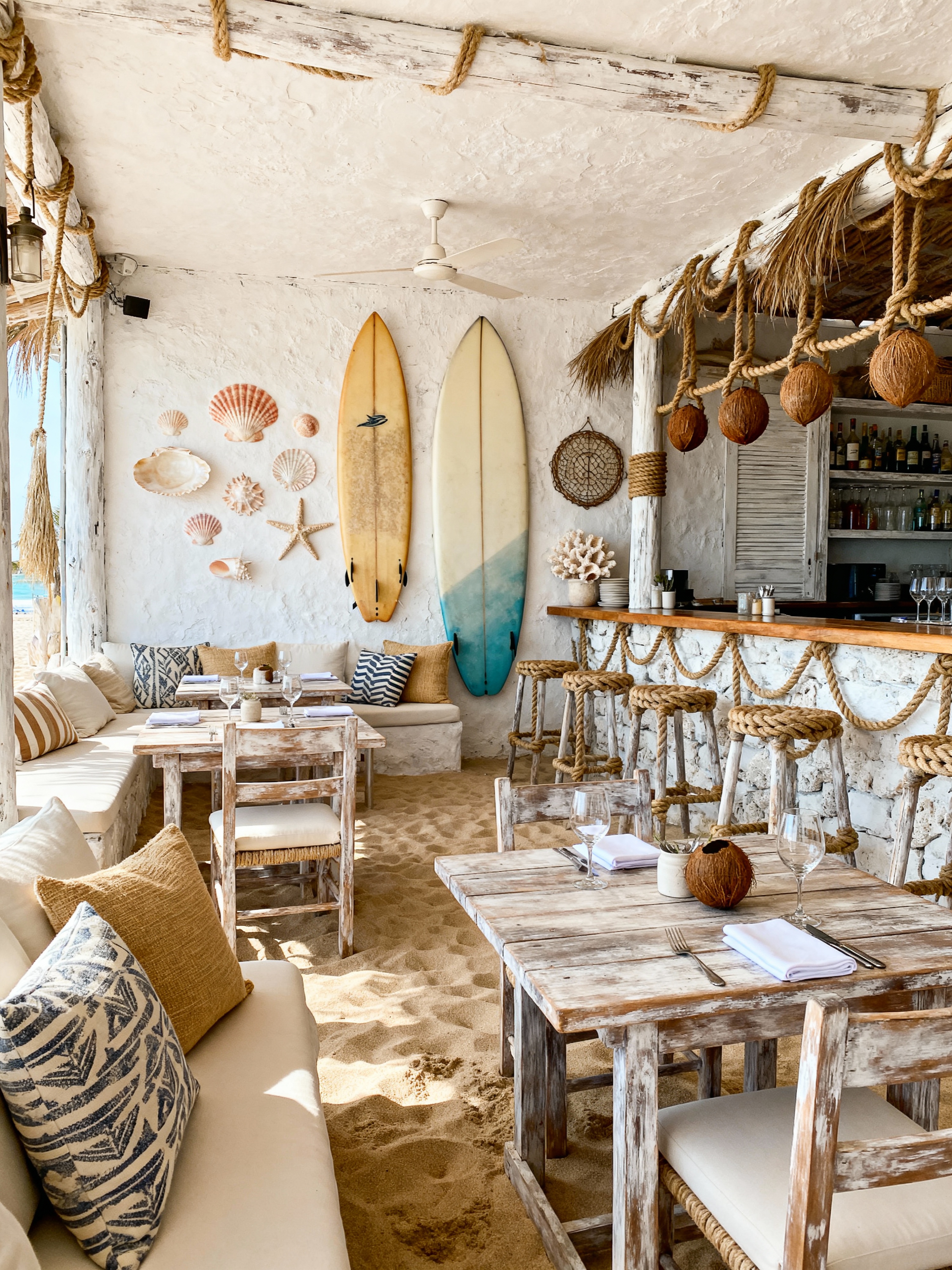 restaurant with surf shack style with restaurant dining tables and restaurant chairs and restaurant decor and restaurant bar and restaurant dining tables. . with seashells and rope details and weathered wood and surfboard decor and beachy throw pillows and coconut decor and white-washed walls and sand-colored textiles