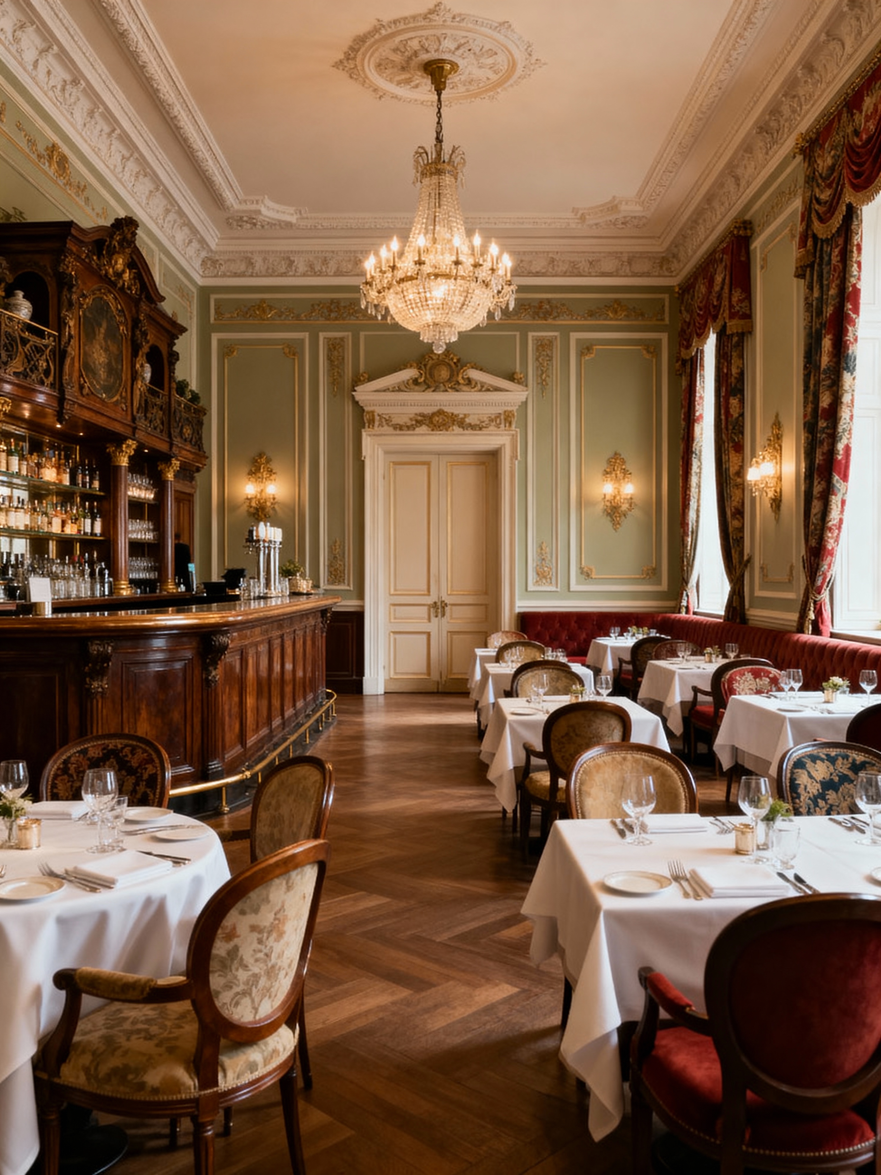 restaurant with traditional style with restaurant bar and restaurant dining tables and restaurant chairs and restaurant decor and restaurant bar. . with formal furniture and crown molding and symmetrical layout and rich fabrics and antique pieces and refined atmosphere and luxurious textiles and ornate details