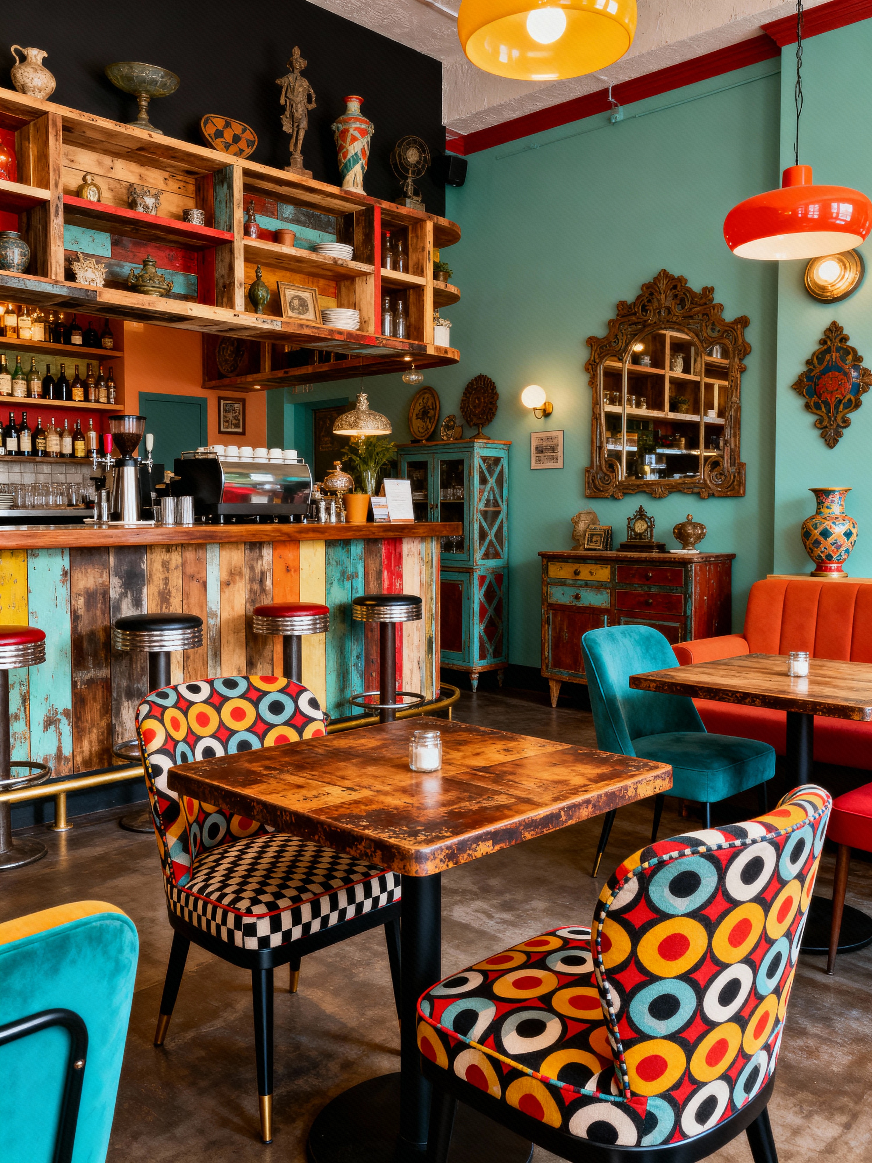 restaurant with vintage style with restaurant bar and restaurant chairs and restaurant dining tables and restaurant decor and restaurant bar. . with timeless pieces and retro style and upcycled furniture and colorful accents and eclectic and bold patterns and mid-century and antique decor