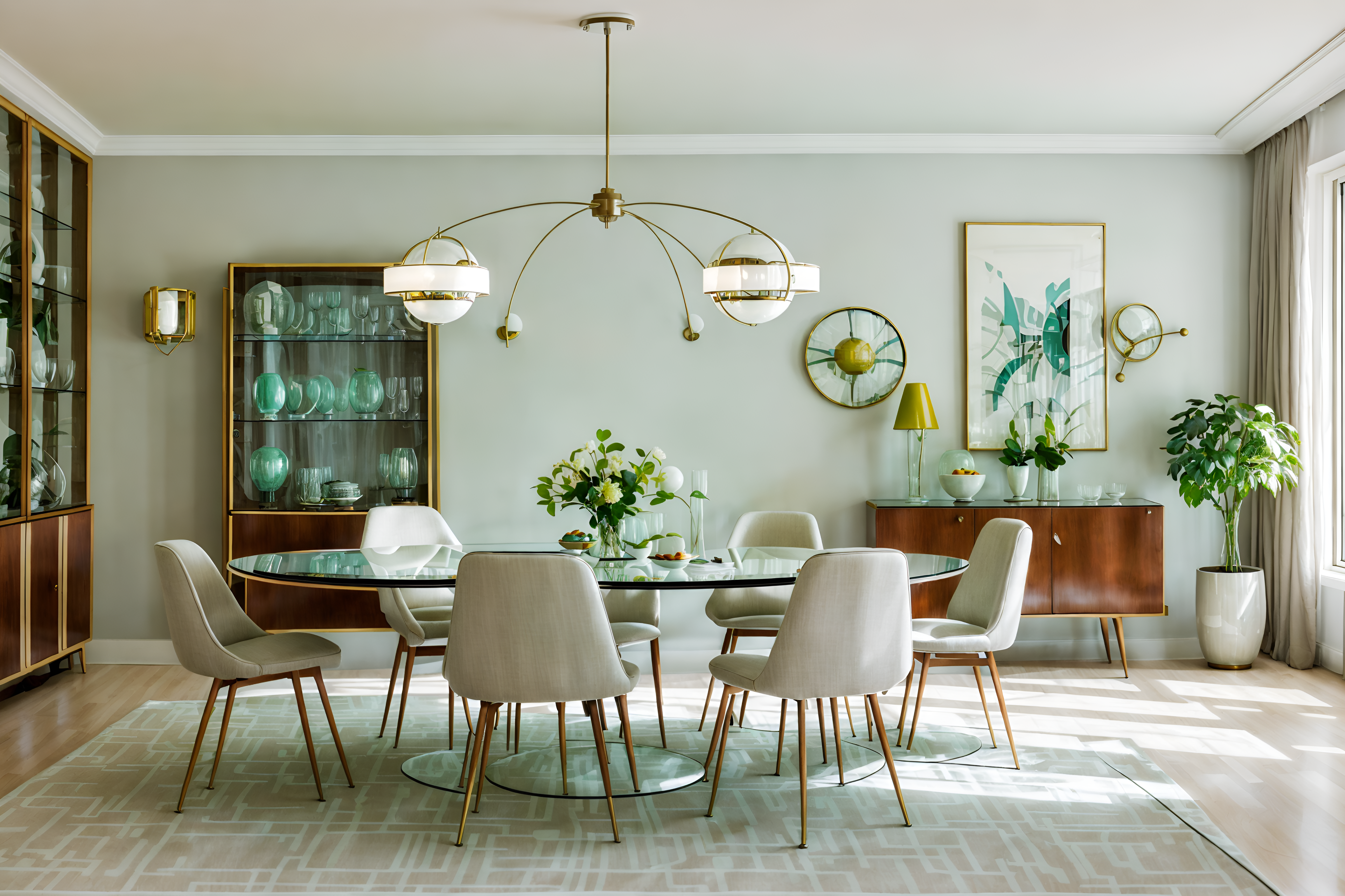 photo from pinterest of retro futuristic-style interior designed (dining room interior) with light or chandelier and table cloth and painting or photo on wall and vase and bookshelves and dining table chairs and plant and dining table. . with circular shapes and glass panes and smooth polished marble and neutral background and bright accents and light colors and vintage futurism and floating surfaces and minimalist clean lines. . cinematic photo, highly detailed, cinematic lighting, ultra-detailed, ultrarealistic, photorealism, 8k. trending on pinterest. retro futuristic interior design style. masterpiece, cinematic light, ultrarealistic+, photorealistic+, 8k, raw photo, realistic, sharp focus on eyes, (symmetrical eyes), (intact eyes), hyperrealistic, highest quality, best quality, , highly detailed, masterpiece, best quality, extremely detailed 8k wallpaper, masterpiece, best quality, ultra-detailed, best shadow, detailed background, detailed face, detailed eyes, high contrast, best illumination, detailed face, dulux, caustic, dynamic angle, detailed glow. dramatic lighting. highly detailed, insanely detailed hair, symmetrical, intricate details, professionally retouched, 8k high definition. strong bokeh. award winning photo.