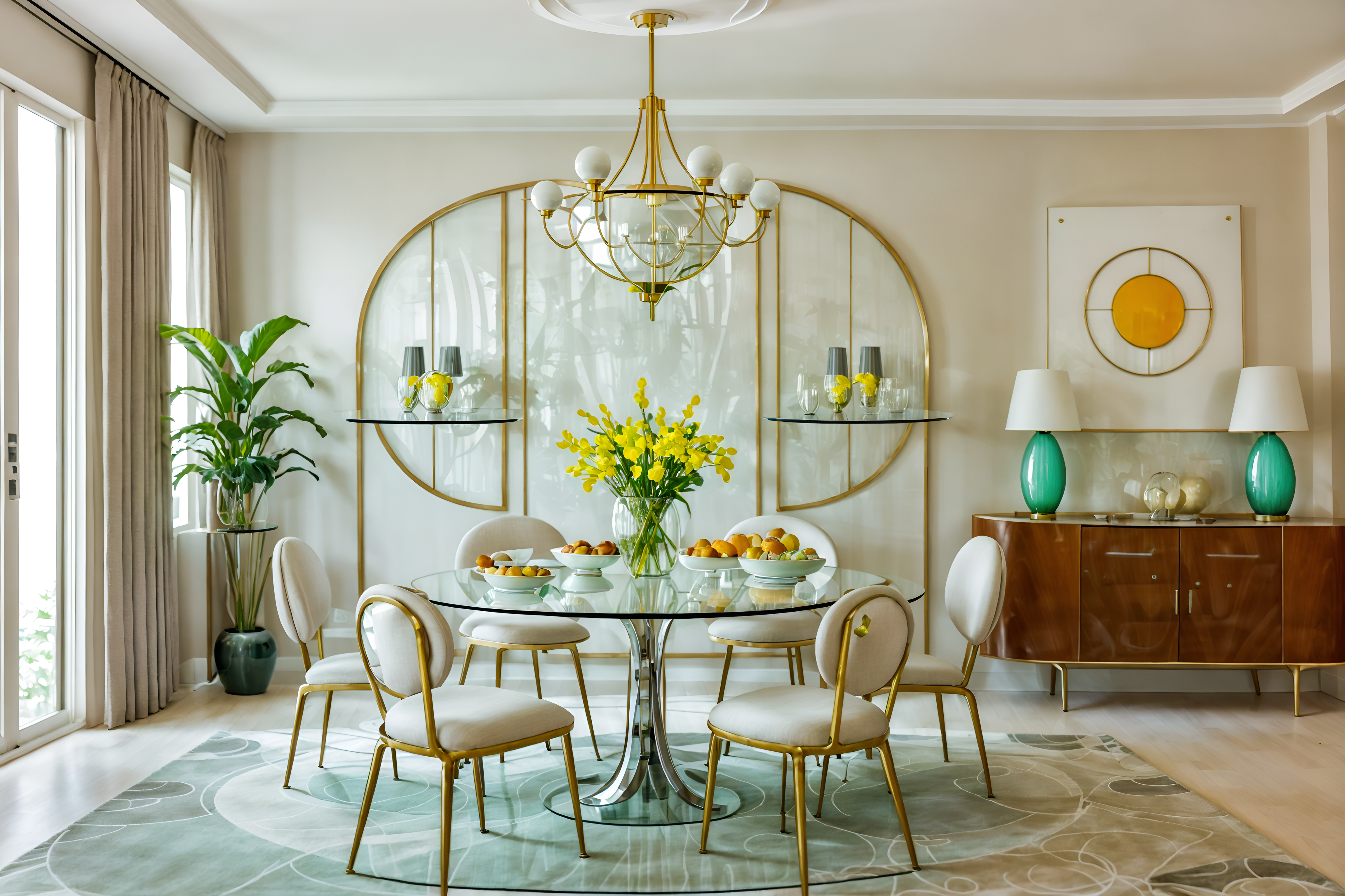 photo from pinterest of retro futuristic-style interior designed (dining room interior) with light or chandelier and table cloth and painting or photo on wall and vase and bookshelves and dining table chairs and plant and dining table. . with circular shapes and glass panes and smooth polished marble and neutral background and bright accents and light colors and vintage futurism and floating surfaces and minimalist clean lines. . cinematic photo, highly detailed, cinematic lighting, ultra-detailed, ultrarealistic, photorealism, 8k. trending on pinterest. retro futuristic interior design style. masterpiece, cinematic light, ultrarealistic+, photorealistic+, 8k, raw photo, realistic, sharp focus on eyes, (symmetrical eyes), (intact eyes), hyperrealistic, highest quality, best quality, , highly detailed, masterpiece, best quality, extremely detailed 8k wallpaper, masterpiece, best quality, ultra-detailed, best shadow, detailed background, detailed face, detailed eyes, high contrast, best illumination, detailed face, dulux, caustic, dynamic angle, detailed glow. dramatic lighting. highly detailed, insanely detailed hair, symmetrical, intricate details, professionally retouched, 8k high definition. strong bokeh. award winning photo.