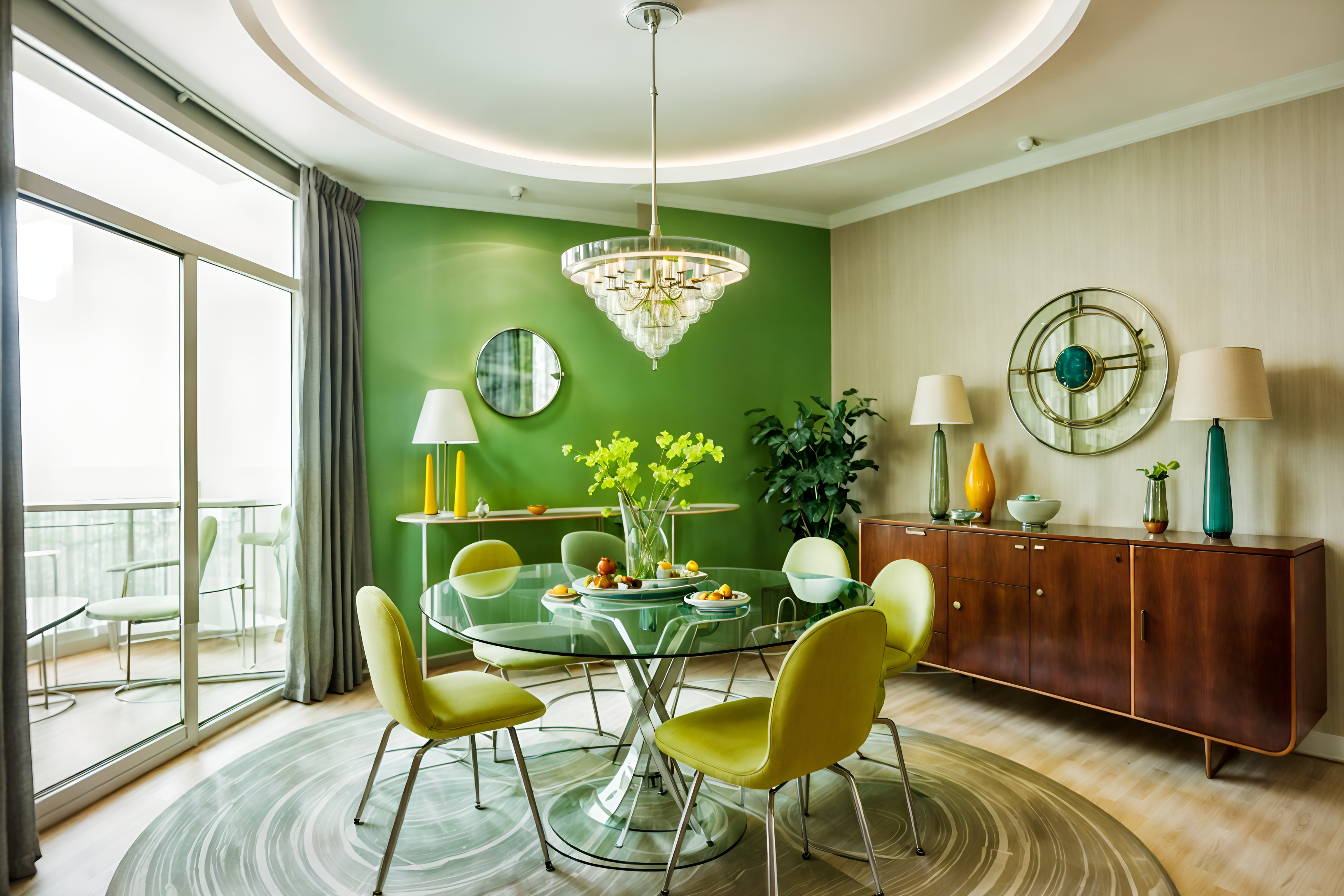 photo from pinterest of retro futuristic-style interior designed (dining room interior) with light or chandelier and table cloth and painting or photo on wall and vase and bookshelves and dining table chairs and plant and dining table. . with circular shapes and glass panes and smooth polished marble and neutral background and bright accents and light colors and vintage futurism and floating surfaces and minimalist clean lines. . cinematic photo, highly detailed, cinematic lighting, ultra-detailed, ultrarealistic, photorealism, 8k. trending on pinterest. retro futuristic interior design style. masterpiece, cinematic light, ultrarealistic+, photorealistic+, 8k, raw photo, realistic, sharp focus on eyes, (symmetrical eyes), (intact eyes), hyperrealistic, highest quality, best quality, , highly detailed, masterpiece, best quality, extremely detailed 8k wallpaper, masterpiece, best quality, ultra-detailed, best shadow, detailed background, detailed face, detailed eyes, high contrast, best illumination, detailed face, dulux, caustic, dynamic angle, detailed glow. dramatic lighting. highly detailed, insanely detailed hair, symmetrical, intricate details, professionally retouched, 8k high definition. strong bokeh. award winning photo.