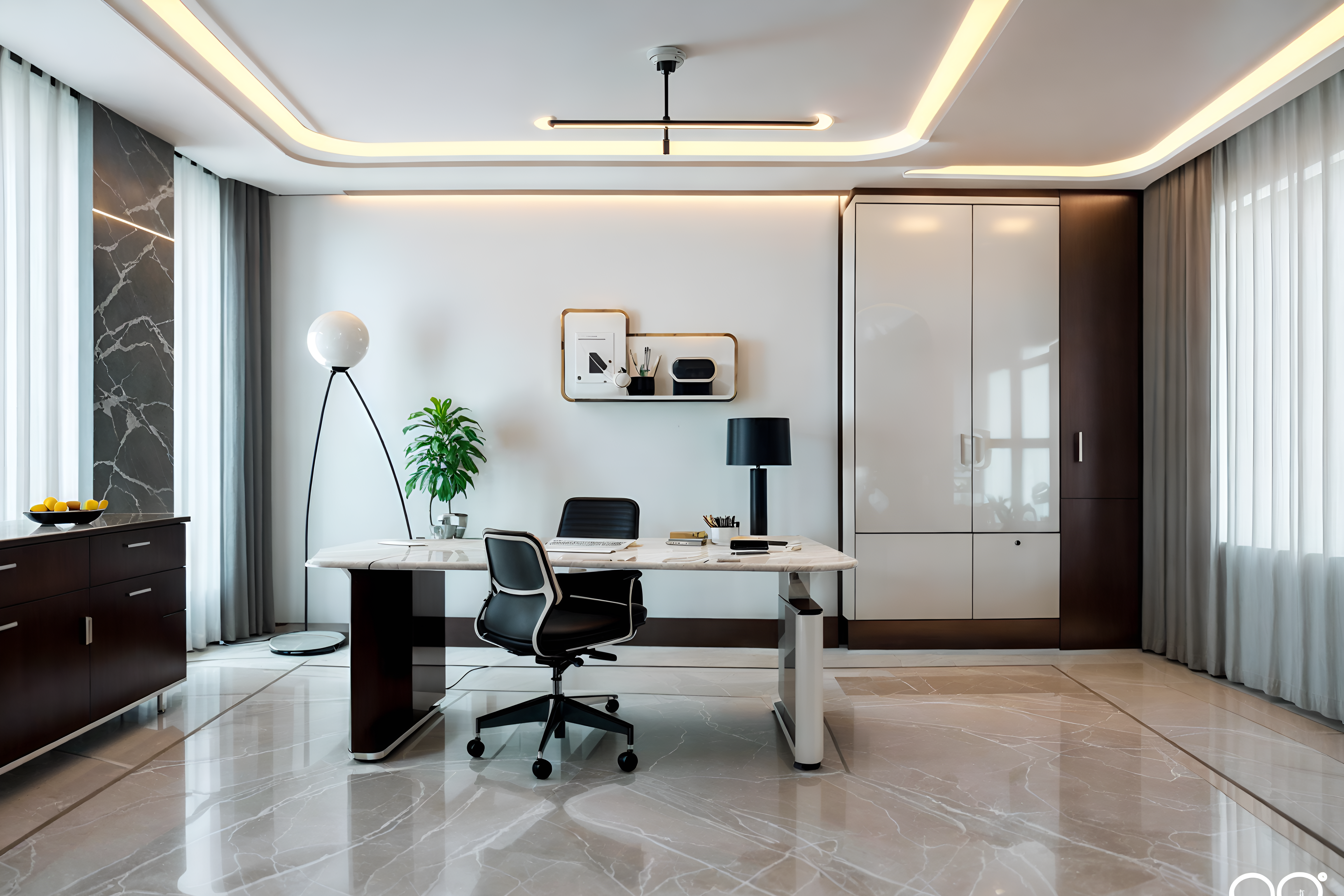 photo from pinterest of retro futuristic-style interior designed (home office interior) with desk lamp and computer desk and cabinets and plant and office chair and desk lamp. . with circular shapes and monochromatic palette and smooth marble and smooth polished marble and futuristic interior and neutral background and bright accents and minimalist clean lines and glass panes. . cinematic photo, highly detailed, cinematic lighting, ultra-detailed, ultrarealistic, photorealism, 8k. trending on pinterest. retro futuristic interior design style. masterpiece, cinematic light, ultrarealistic+, photorealistic+, 8k, raw photo, realistic, sharp focus on eyes, (symmetrical eyes), (intact eyes), hyperrealistic, highest quality, best quality, , highly detailed, masterpiece, best quality, extremely detailed 8k wallpaper, masterpiece, best quality, ultra-detailed, best shadow, detailed background, detailed face, detailed eyes, high contrast, best illumination, detailed face, dulux, caustic, dynamic angle, detailed glow. dramatic lighting. highly detailed, insanely detailed hair, symmetrical, intricate details, professionally retouched, 8k high definition. strong bokeh. award winning photo.
