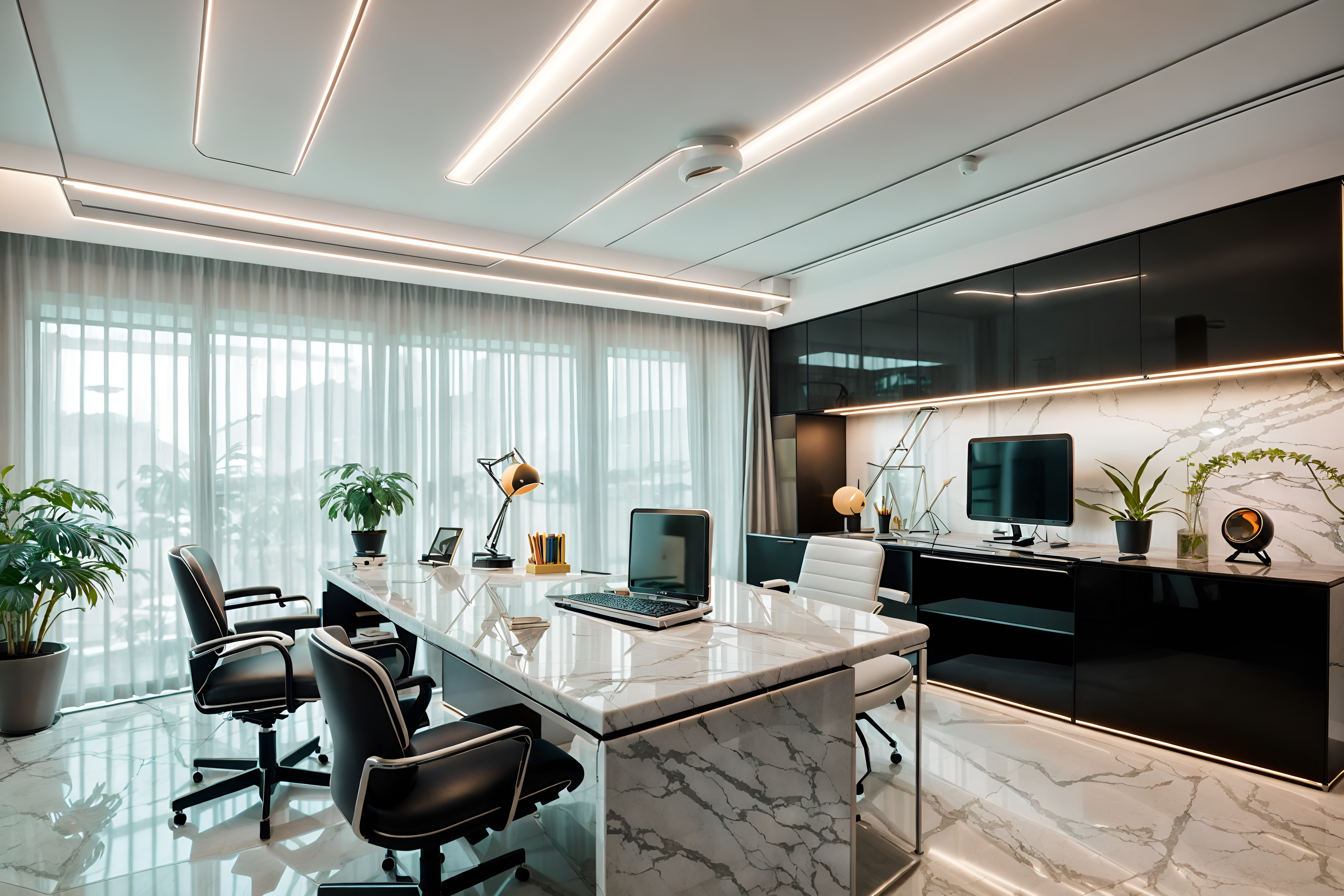 photo from pinterest of retro futuristic-style interior designed (home office interior) with desk lamp and computer desk and cabinets and plant and office chair and desk lamp. . with circular shapes and monochromatic palette and smooth marble and smooth polished marble and futuristic interior and neutral background and bright accents and minimalist clean lines and glass panes. . cinematic photo, highly detailed, cinematic lighting, ultra-detailed, ultrarealistic, photorealism, 8k. trending on pinterest. retro futuristic interior design style. masterpiece, cinematic light, ultrarealistic+, photorealistic+, 8k, raw photo, realistic, sharp focus on eyes, (symmetrical eyes), (intact eyes), hyperrealistic, highest quality, best quality, , highly detailed, masterpiece, best quality, extremely detailed 8k wallpaper, masterpiece, best quality, ultra-detailed, best shadow, detailed background, detailed face, detailed eyes, high contrast, best illumination, detailed face, dulux, caustic, dynamic angle, detailed glow. dramatic lighting. highly detailed, insanely detailed hair, symmetrical, intricate details, professionally retouched, 8k high definition. strong bokeh. award winning photo.